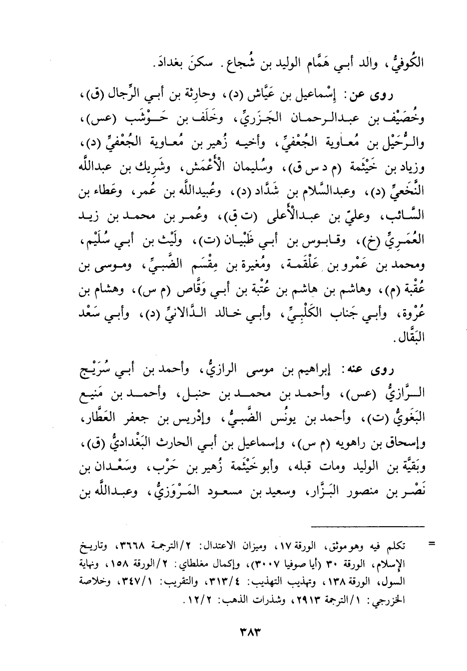 الكوفي، والد أبي همام الْوَلِيد بْن شجاع. سكن بغداد.