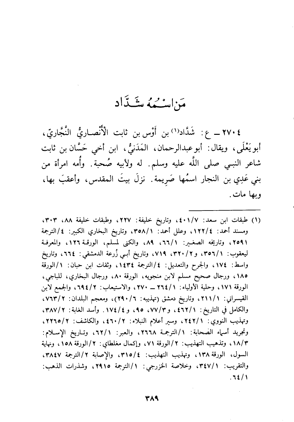 2704 - ع: شداد بن أوس بن ثابت الأَنْصارِيّ النجاري (1) ، أيو يَعْلَى، ويُقال: أَبُو عَبْد الرحمن، المدني، ابْن أخي حسان بْن ثابت شاعر النَّبِيّ صَلَّى اللَّهُ عَلَيْهِ وسَلَّمَ. له ولأَبِيه صحبة. وأمه امرأة من بني عدي بْن النجار اسمها صريمة. نزل بيت المقدس، واعقب بها، وبها مات.