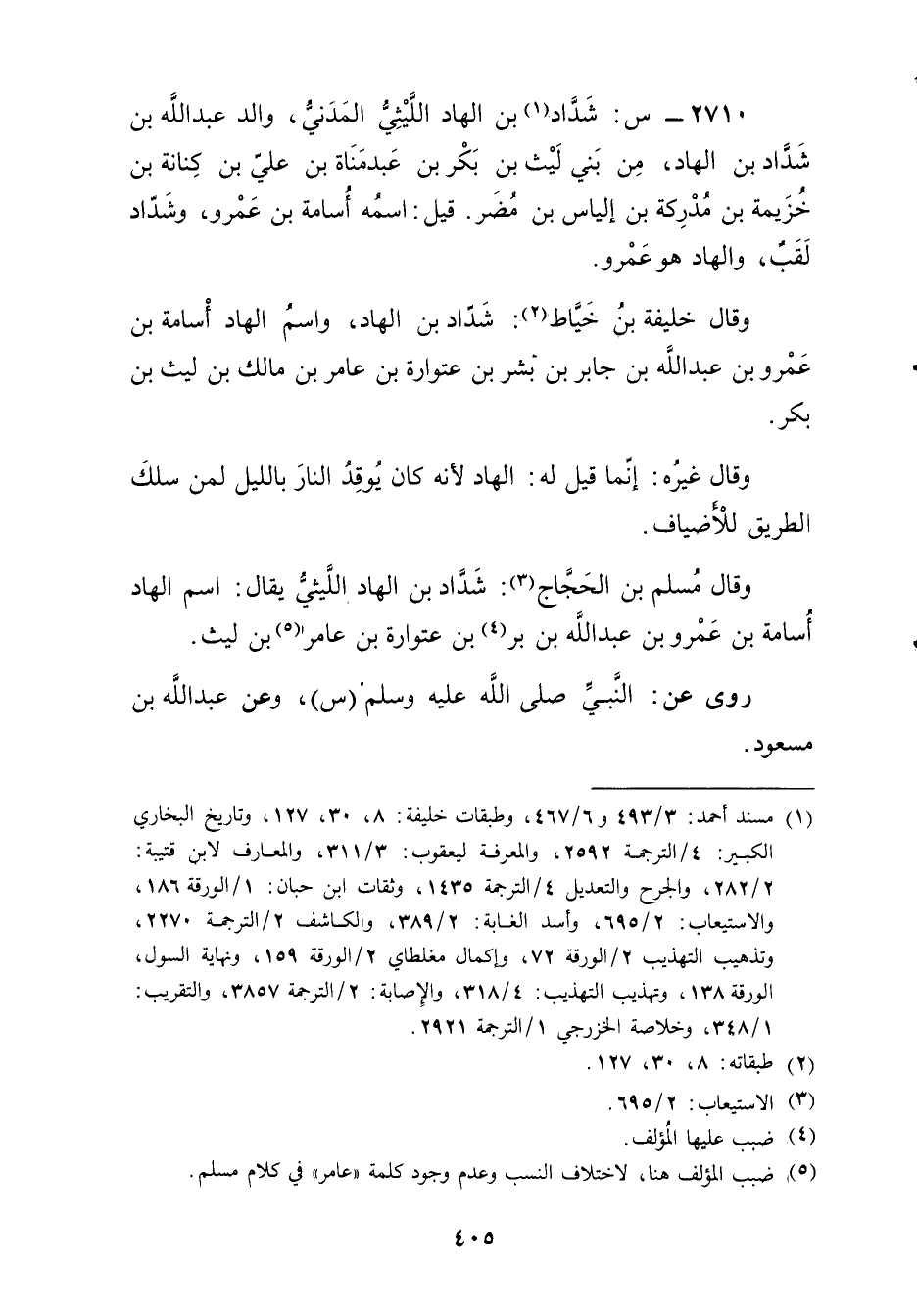 وَقَال مسلم بْن الحجاج (3) : شداد بْن الهاد الليثي يقال: اسم الهاد أسامة بْن عَمْرو بْن عَبد اللَّهِ بْن بر (4) بْن عتوارة بْن عامر (5) بْن ليث.
