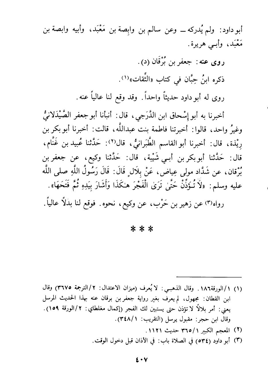 أَخْبَرَنَا بِهِ أَبُو إِسْحَاقَ ابْنُ الدَّرَجِيِّ، قال: أنبأنا أَبُو جَعْفَرٍ الصَّيْدَلانِيُّ وغَيْرُ واحِدٍ، قَالُوا: أَخْبَرَتْنَا فَاطِمَةُ بِنْتُ عَبد اللَّهِ، قَالَتْ: أخبرنا أَبُو بَكْرِ بْنُ رِيذَةَ، قال: أخبرنا أَبُو الْقَاسِمِ الطَّبَرَانِيُّ، قال (2) : حَدَّثَنَا عُبَيد بْنُ غَنَّامٍ، قال: حَدَّثَنَا أَبُو بَكْر بْن أَبي شَيْبَة، قال: حَدَّثَنَا وكيع، عن جَعْفَرِ بْنِ بُرَقَانَ، عَنْ شَدَّادٍ مَوْلَى عِيَاضٍ، عَنْ بِلالٍ قال: قال رَسُولُ اللَّهِ صلى الله عَلَيْهِ وسَلَّمَ: لا تُؤَذِّنْ حَتَّى تَرَى الْفَجْرَ هَكَذَا وأَشَارَ بِيَدِهِ ثُمَّ فَتَحَهَا.