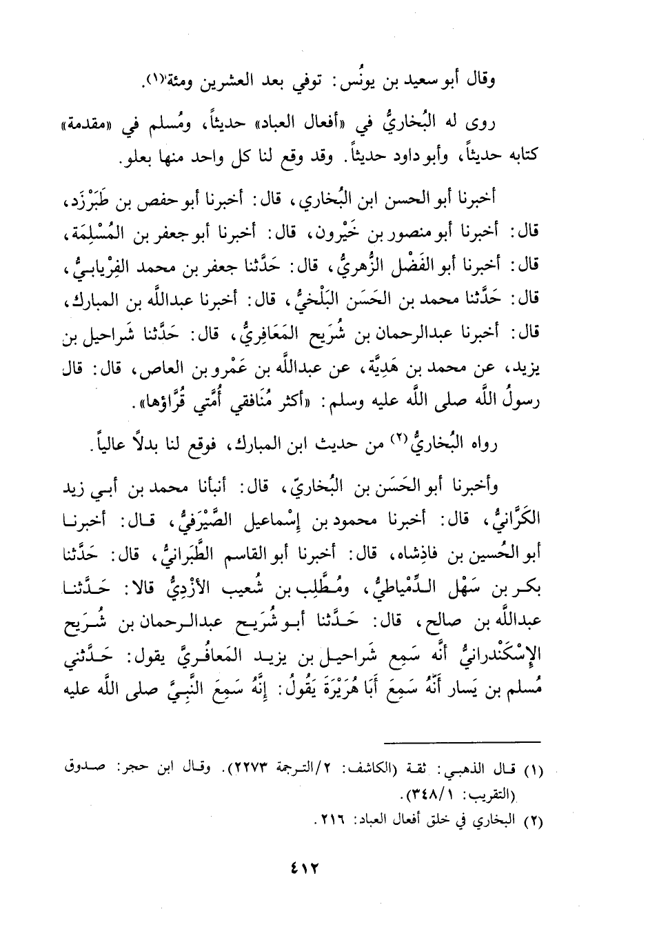 أخبرنا أَبُو الحسن بْن البخاري، قال: أَخْبَرَنَا أبو حفص بن طَبَرْزَذَ، قال: أخبرنا أَبُو منصور بْن خَيْرُونَ، قال: أَخْبَرَنَا أَبُو جَعْفَرٍ بْنِ الْمُسْلِمَةِ، قال: أَخْبَرَنَا أَبُو الْفَضْلِ الزُّهْرِيّ، قال: حَدَّثَنَا جَعْفَرُ بْن مُحَمَّد الفريابي، قال: حَدَّثَنَا مُحَمَّد بْن الْحَسَن البلخي، قال: أخبرنا عَبد اللَّهِ بْنُ الْمُبَارَكِ، قال: أخبرنا عَبْد الرَّحْمَنِ بْن شُرَيْحٍ الْمُعَافِرِيُّ، قال: حَدَّثَنَا شَرَاحِيلُ بْنُ يَزِيدَ، عَنْ مُحَمَّدِ بْنِ هَدِيَّةَ، عَنْ عَبد اللَّهِ بْنِ عَمْرو بْنُ الْعَاصِ، قال: قال رَسُول اللَّهِ صلى الله عليه وسَلَّمَ: أَكْثَرُ مُنْافِقِي أُمَّتِي قُرَّاؤُهَا.
