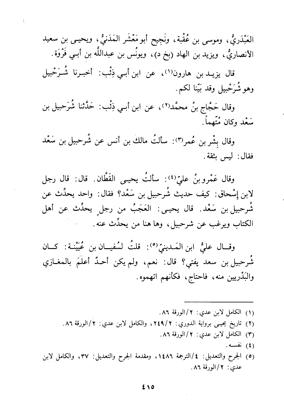 (5) الجرح والتعديل: 4 / الترجمة 1486، ومقدمة الجرح والتعديل: 37، والكامل لابن عدي: 2 / الورقة 86.