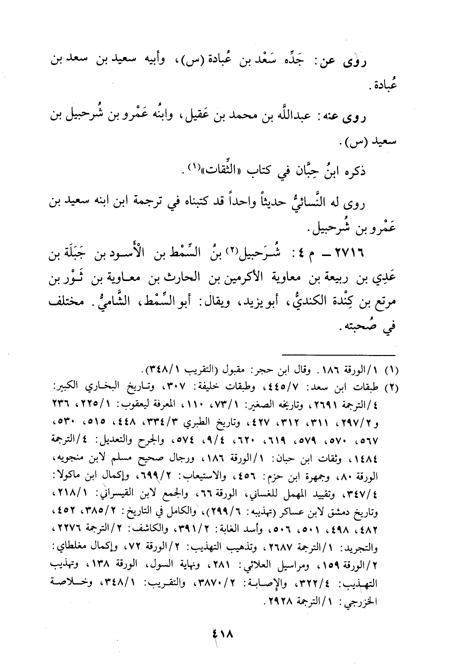 (2) طبقات ابن سعد: 7 / 445، وطبقات خليفة: 307، وتاريخ البخاري الكبير: 4 / الترجمة 2691، وتاريخه الصغير: 1 / 73، 110، المعرفة ليعقوب: 1 / 225، 236 و2 / 297، 311، 312، 427، وتاريخ الطبري 3 / 334، 448، 515، 530، 567، 570، 579، 619، 620، 4 / 9، 574، والجرح والتعديل: 4 / الترجمة 1484، وثقات ابن حبان: 1 / الورقة 186، ورجال صحيح مسلم لابن منجويه، الورقة 80، وجمهرة ابن حزم: 456، والاستيعاب: 2 / 699، وإكمال ابن ماكولا: 4 / 347، وتقييد المهمل للغساني: الورقة 66، والجمع لابن القيسراني: 1 / 218، وتاريخ دمشق لابن عساكر (تهذيبه: 6 / 299) ، والكامل في التاريخ: 2 / 385، 452، 482، 498، 501، 506، وأسد الغابة: 2 / 391، والكاشف: 2 / الترجمة 2276، والتجريد: 1 / الترجمة 2687، وتذهيب التهذيب: 2 / الورقة 72، وإكمال مغلطاي: 2 / الورقة 159، ومراسيل العلائي: 281، ونهاية السول، الورقة 138، وتهذيب التهذيب: 4 / 322، والاصابة: 2 / 3870، والتقريب: 1 / 348، وخلاصة الخزرجي: 1 / الترجمة 2928.