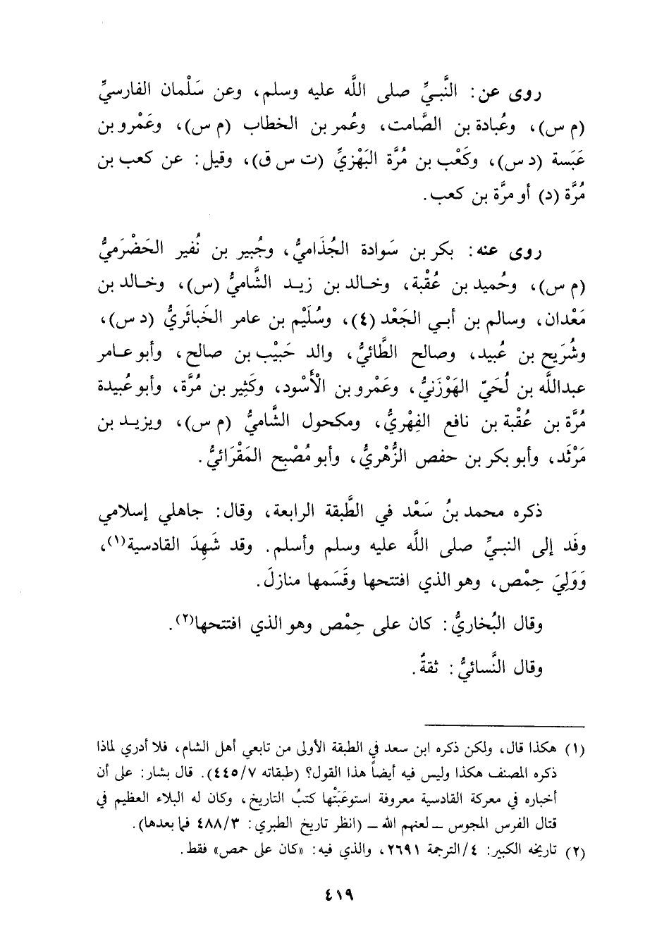 (1) هكذا قال، ولكن ذكره ابن سعد في الطبقة الأولى من تابعي أهل الشام، فلا أدري لماذا ذكره المصنف هكذا وليس فيه أيضا هذا القول؟ (طبقاته 7 / 445) . قال بشار: على أن أخباره في معركة القادسية معروفة استوعبتها كتب التاريخ، وكان له البلاء العظيم في قتال الفرس المجوس - لعنهم الله - (انظر تاريخ الطبري: 3 / 488 فما بعدها) .