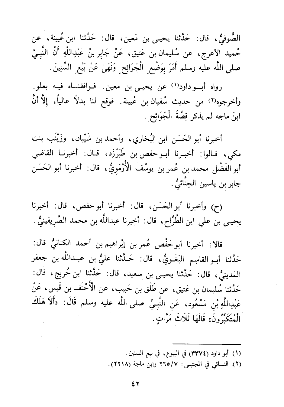 الصُّوفِيُّ، قال: حَدَّثَنَا يَحْيَى بْنُ مَعِين، قال: حَدَّثَنَا ابْنُ عُيَيْنَة، عَنْ حُمَيْدٍ الأَعْرَجِ، عَنْ سُلَيْمان بْنِ عَتِيقٍ، عَنْ جَابِرِ بْنِ عَبد اللَّهِ أَنَّ النَّبِيَّ صَلَّى اللَّهُ عَلَيْهِ وسَلَّمَ أَمَرَ بِوَضْعِ الْجَوَائِحِ ونَهَى عَنْ بَيْعِ السِّنِينَ.