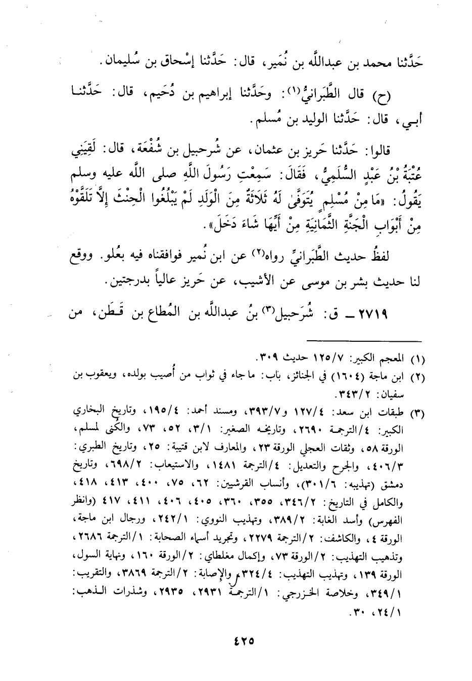 قَالُوا: حَدَّثَنَا حَرِيزُ بْنُ عُثْمَانَ، عَنْ شُرَحْبِيلَ بْنِ شُفْعَةَ، قال: لَقِيَنِي عُتْبَةُ بْنُ عَبْدٍ السُّلَمِيُّ، فَقال: سَمِعْتُ رَسُولَ اللَّهِ صلى الله عليه وسلم يَقُولُ: مَا مِنْ مُسْلِمٍ يُتَوَفَّى لَهُ ثَلاثَةٌ مِنَ الْوَلَدِ لَمْ يَبْلُغُوا الْحِنْثَ إِلا تَلَقَّوْهُ مِنْ أَبْوَابِ الْجَنَّةِ الثَّمَانِيَةِ مِنْ أَيِّهَا شَاءَ دَخَلَ.