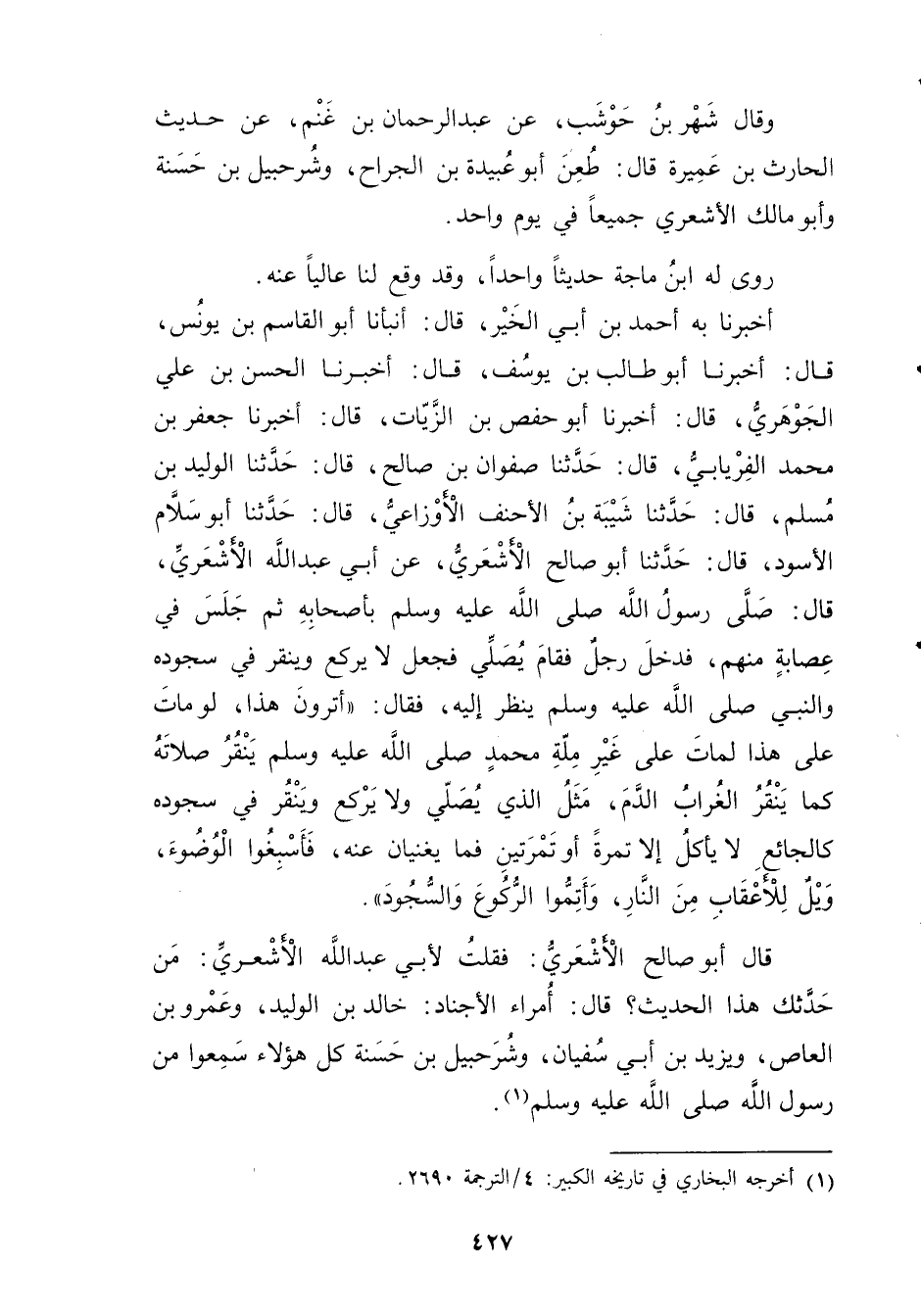 أَخْبَرَنَا بِهِ أَحْمَد بْن أَبي الخير، قال: أَنَبَأَنَا أَبُو الْقَاسِمِ بْنُ يُونُسَ، قال: أخبرنا أَبُو طَالِبِ بْنِ يُوسُفَ، قال: أخبرنا الْحَسَن بْن علي الجوهري، قال: أَخْبَرَنَا أَبُو حَفْصِ بْنُ الزَّيَّاتِ، قال: أخبرنا جَعْفَرُ بْنُ مُحَمَّدٍ الْفِرْيَابِيُّ، قال: حَدَّثَنَا صَفْوَانُ بْنُ صَالِحٍ، قال: حَدَّثَنَا الْوَلِيدُ بْنُ مُسْلِمٍ، قال: حَدَّثَنَا شَيْبَة بْنُ الأَحنف الأَوزاعِيّ، قال: حَدَّثَنَا أَبُو سَلامٍ الأَسْوَدُ، قال: حَدَّثَنَا أَبُو صَالِحٍ الأَشْعَرِيُّ، عَن أَبِي عَبد اللَّهِ الأَشْعَرِيِّ، قال: صَلَّى رَسُولُ اللَّهِ صَلَّى اللَّهُ عَلَيْهِ وسَلَّمَ بِأَصْحَابِهِ ثُمَّ جَلَسَ فِي عِصَابَةٍ مِنْهُمْ، فَدَخَلَ رَجُلٌ فَقَامَ يُصَلِّي فَجَعَلَ لا يَرْكَعُ ويَنْقُرُ فِي سُجُودِهِ والنَّبِيُّ صَلَّى اللَّهُ عَلَيْهِ وسَلَّمَ يَنْظُرُ إِلَيْهِ، فَقال: أَتَرَوْنَ هَذَا، لَوْ مَاتَ عَلَى هَذَا لَمَاتَ عَلَى غَيْرِ مِلَّةِ مُحَمَّدٍ صَلَّى اللَّهُ عَلَيْهِ وسَلَّمَ يَنْقُرُ صَلاتَهُ كَمَا يَنْقُرُ الْغُرَابُ الدَّمَ، مَثَلُ الَّذِي يُصَلِّي ولا يَرْكَعُ ويَنْقُرُ فِي سُجُودِهِ كَالْجَائِعِ لا يَأْكُلُ إِلا تَمْرَةً أَوْ تَمْرَتَيْنِ فَمَا يُغْنِيَانِ عَنْهُ، فَأَسْبِغُوا الْوُضُوءَ، ويْلٌ لِلأَعْقَابِ مِنَ النَّارِ، وأَتِمُّوا الرُّكُوعَ والسُّجُودَ.