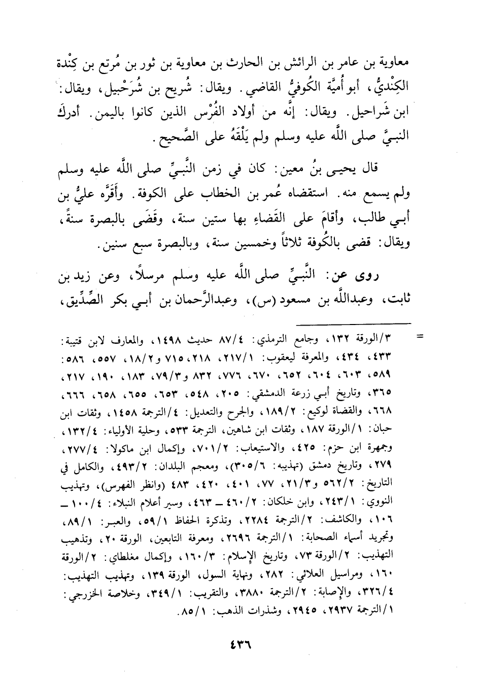 = 3 / الورقة 132، وجامع التِّرْمِذِيّ: 4 / 87 حديث 1498، والمعارف لابن قتيبة: 433، 434، والمعرفة ليعقوب: 1 / 217، 218، 715 و2 / 18، 557، 586: 589، 603، 604، 652، 670، 776، 832 و3 / 79، 183، 190، 217، 365، وتاريخ أبي زرعة الدمشقي: 205، 548، 653، 655، 658، 666، 668، والقضاة لوكيع: 2 / 189، والجرح والتعديل: 4 / الترجمة 1458، وثقات ابن حبان: 1 / الورقة 187، وثقات ابن شاهين، الترجمة 533، وحلية الاولياء: 4 / 132، وجمهرة ابن حزم: 425، والاستيعاب: 2 / 701، وإكمال ابن ماكولا: 4 / 277، 279، وتاريخ دمشق (تهذيبه: 6 / 305) ، ومعجم البلدان: 2 / 493، والكامل في التاريخ: 2 / 562 و3 / 21، 77، 401، 420، 483،، وتهذيب النووي: 1 / 243، وابن خلكان: 2 / 460 - 463، وسير أعلام النبلاء: 4 / 100 - 106، والكاشف: 2 / الترجمة 2284، وتذكرة الحفاظ 1 / 59، والعبر: 1 / 89، وتجريد أسماء الصحابة: 1 / الترجمة 2696، ومعرفة التابعين، الورقة 20، وتذهيب التهذيب: 2 / الورقة 73، وتاريخ الاسلام: 3 / 160، وإكمال مغلطاي: 2 / الورقة 160، ومراسيل العلائي: 282، ونهاية السول، الورقة 139، وتهذيب التهذيب: 4 / 326، والاصابة: 2 / الترجمة 3880، والتقريب: 1 / 349، وخلاصة الخزرجي: 1 / الترجمة 2937، 2945، وشذرات الذهب: 1 / 85.