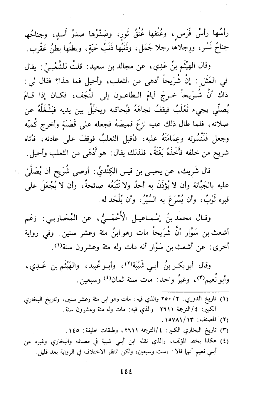 وَقَال الهيثم بْن عدي، عَنْ مجالد بْن سَعِيد: قلت للشعبي: يقال فِي المثل: إن شريحا أدهى من الثعلب، واحيل فما هذا؟ فقال لي: ذاك إن شريحا خرج أيام الطاعون إلى النجف، فكان إذا قام يصلي يجئ ثعلب فيقف تجاهه فيحاكيه ويخيل بين يديه فيشغله عَنْ صلاته، فلما طال ذلك عليه نزع قميصه فجعله على قصبة واخرج كميه وجعل قلنسوته وعمامته عليه، فأقبل الثعلب فوقف على عادته، فأتاه شريح من خلفه فأخذه بغتة، فلذلك يقال: هو ادهى من الثعلب وأحيل.