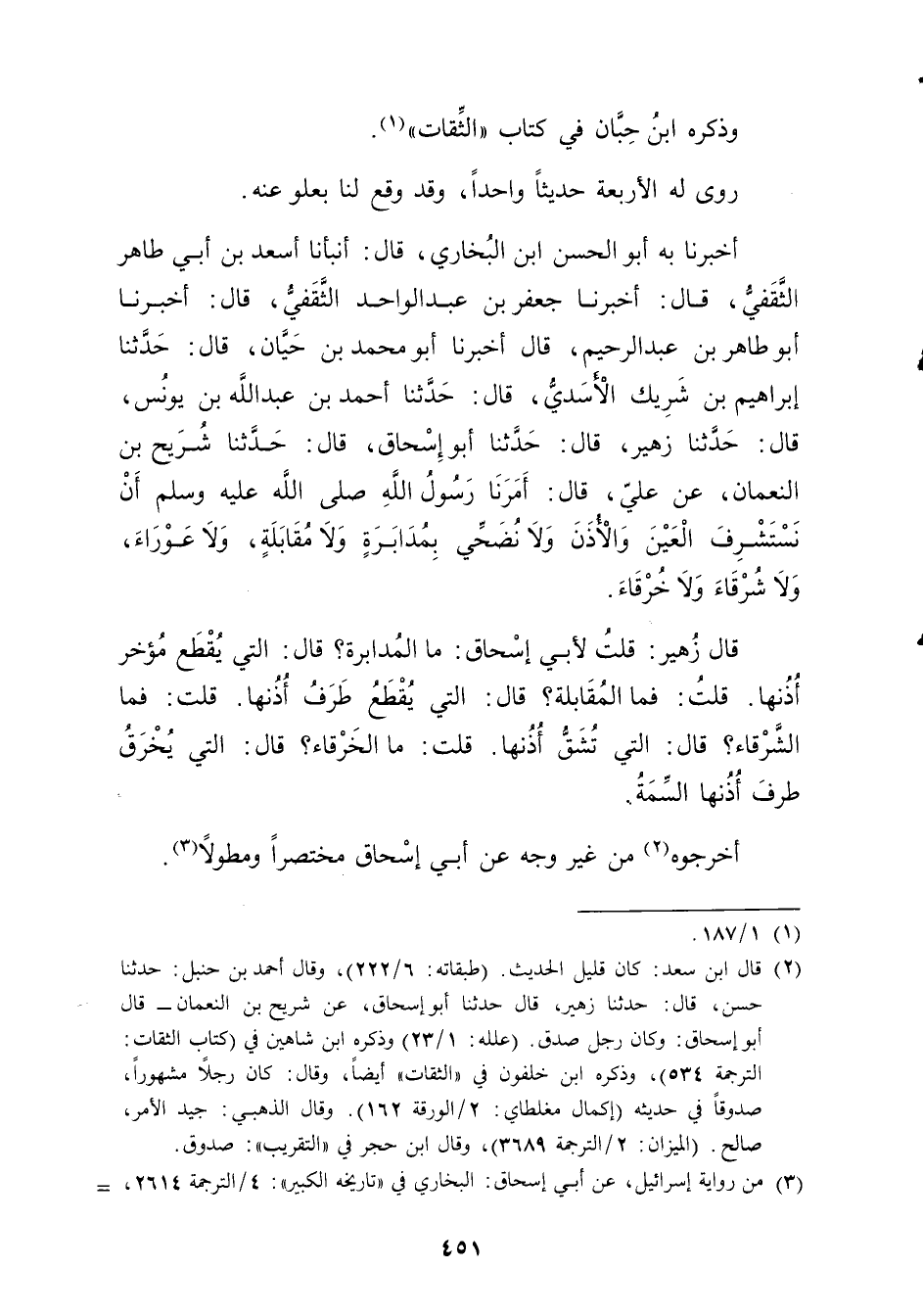 أَخْبَرَنَا بِهِ أبو الحسن بْن البخاري، قال: أَنْبَأَنَا أَسْعَدُ بْنُ أَبي طَاهِرٍ الثَّقَفِيُّ، قال: أَخْبَرَنَا جَعْفَرُ بْنُ عَبْدِ الْوَاحِدِ الثَّقَفِيُّ، قال: أَخْبَرَنَا أَبُو طَاهِرِ بْنُ عَبد الرَّحِيمِ، قال أَخْبَرَنَا أَبُو مُحَمَّدِ بْنُ حَيَّانَ، قال: حَدَّثَنَا إِبْرَاهِيمُ بْنُ شَرِيك الأَسَدِيُّ، قال: حَدَّثَنَا أَحْمَدُ بْن عَبد اللَّهِ بْن يونس، قال: حَدَّثَنَا زهير، قال: حَدَّثَنَا أَبُو إِسْحَاقَ، قال: حَدَّثَنَا شُرَيْحُ بْنُ النُّعْمَانِ، عَنْ عَلِيٍّ، قال: أَمَرَنَا رَسُولُ اللَّهِ صَلَّى اللَّهُ عليه وسلم أَنْ نَسْتَشْرِفَ الْعَيْنَ والأُذُنَ ولا نُضَحِّيَ بِمُدَابَرَةٍ ولا مُقَابَلَةٍ، ولا عَوْرَاءَ، ولا شَرْقَاءَ ولا خَرْقَاءَ.