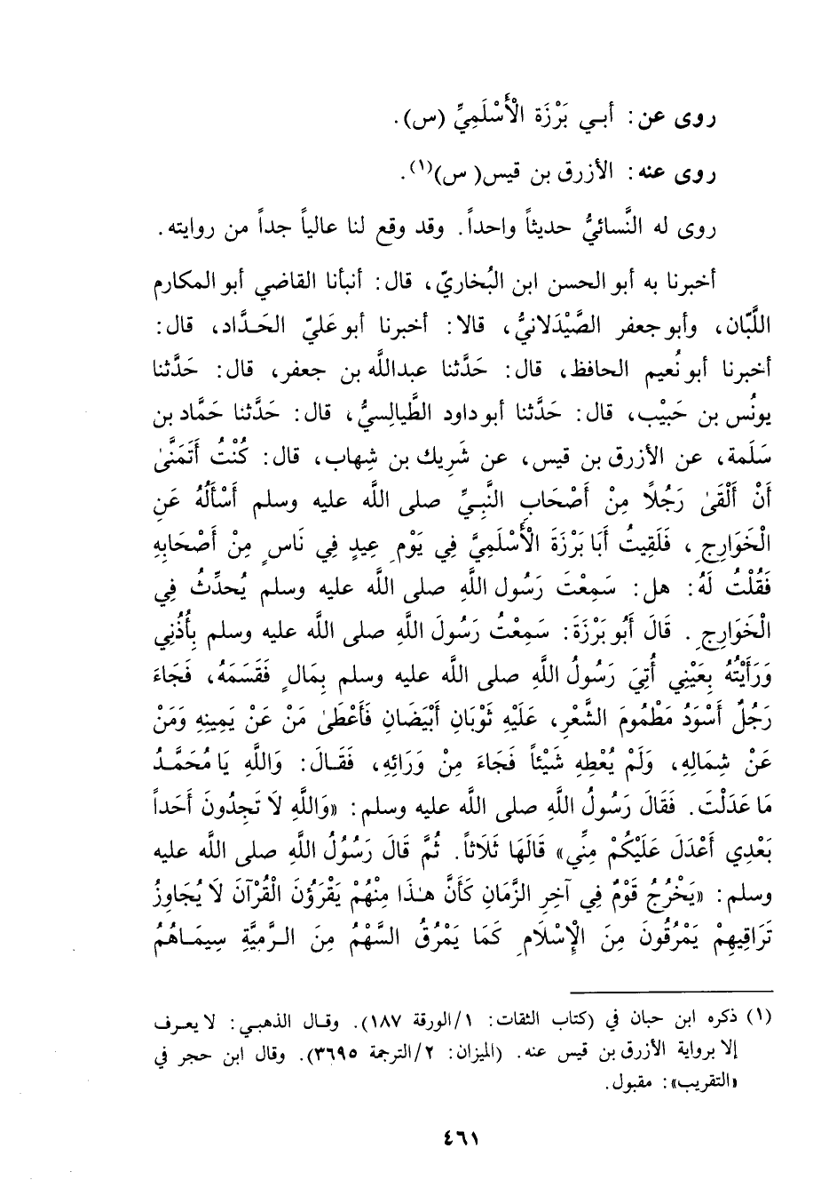 أَخْبَرَنَا بِهِ أَبُو الْحَسَنِ بْنُ الْبُخَارِيِّ، قال: أَنْبَأَنَا القاضي أَبُو المكارم اللبان، وأبو جعفر الصيدلاني، قالا: أَخْبَرَنَا أَبُو عَلِيّ الحداد، قال: أَخْبَرَنَا أبو نعيم الحافظ، قال: حَدَّثَنَا عَبد الله بْن جعفر، قال: حَدَّثَنَا يُونُسُ بْنُ حَبِيبٍ، قال: حَدَّثَنَا أبو داود الطيالسي، قال: حَدَّثَنَا حماد بْن سلمة، عَنِ الأَزْرَقِ بْنِ قَيْسٍ، عَنْ شَرِيك بْنِ شِهَابٍ، قال: كُنْتُ أَتَمَنَّى أَنْ أَلْقَى رَجُلا مِنْ أصحاب النَّبِيّ صَلَّى اللَّهُ عليه وسَلَّمَ أَسْأَلُهُ عَنِ الْخَوَارِجِ، فَلَقِيتُ أَبَا بَرْزَةَ الأَسلميّ فِي يَوْمِ عِيدٍ فِي نَاسٍ مِنْ أَصْحَابِهِ فَقُلْتُ لَهُ: هَلْ: سَمِعْتَ رَسُولَ اللَّهِ صلى الله عليه وسلم يحدث في الخوارج. قال أبوبرزة: سمعت رَسُول اللَّهِ صَلَّى اللَّهُ عَلَيْهِ وسَلَّمَ بِأُذُنِي ورَأَيْتُهُ بِعَيْنِي أَتَى رَسُولَ اللَّهِ صلى الله عَلَيْهِ وسَلَّمَ بِمَالٍ فَقَسَّمَهُ، فَجَاءَ رَجُلٌ أَسْوَدُ مَطْمُومُ الشَّعْرِ، عَلَيْهِ ثَوْبَانِ أَبِيَضَانِ فَأَعْطَى مَنْ عَنْ يَمِينِهِ ومَنْ عَنْ شِمَالِهِ، ولَمْ يُعْطِهِ شَيْئًا فَجَاءَ مِنْ ورَائِهِ، فَقال: واللَّهِ يَا مُحَمَّدُ مَا عَدَلْتَ. فَقال رَسُولُ اللَّهِ صَلَّى اللَّهُ عَلَيْهِ وسَلَّمَ: واللَّهِ لا تَجِدُونَ أَحَدًا بَعْدِي أَعْدَلَ عَلَيْكُمْ مِنِّي"قَالَهَا ثَلاثًا. ثُمَّ قال رَسُول اللَّهِ صلى الله عليه وسَلَّمَ: يَخْرُجُ قَوْمٌ فِي آخِرِ الزمان كأن هذا منهم يقرؤن القرآن لا يجاوز تراقيم يَمْرُقُونَ مِنَ الإِسْلامِ كَمَا يَمْرُقُ السهم من الرمية سيماهم