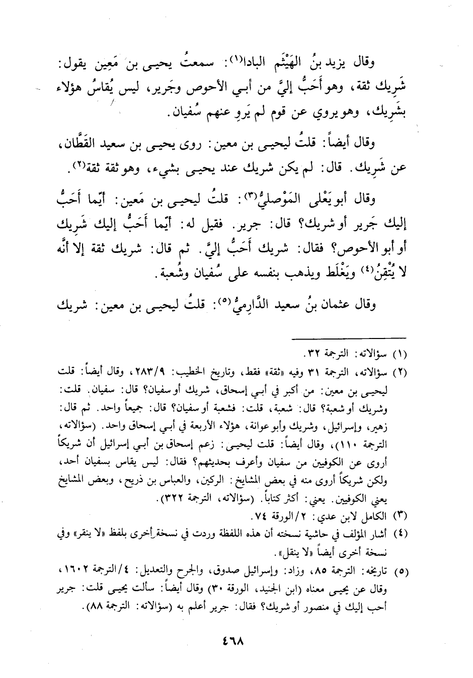 (2) سؤالاته، الترجمة 31 وفيه"ثقة"فقط، وتاريخ الخطيب: 9 / 283، وَقَال أيضا: قلت ليحيى بْن مَعِين: من أكبر في أبي إسحاق، شَرِيك أو سفيان؟ قال: سفيان. قلت: وشَرِيك أو شعبة؟ قال: شعبة، قلت: فشعبة أو سفيان؟ قال: جميعا واحد. ثم قال: زهير، وإسرائيل، وشَرِيك وأبو عوانة، هؤلاء الأربعة في أبي إسحاق واحد. (سؤالاته، الترجمة 110) ، وَقَال أيضا: قلت ليحيى: زعم إسحاق بْن أَبي إسرائيل إن شَرِيكا أروى عن الكوفيين من سفيان وأعرف بحديثهم؟ فقال: ليس يقاس بسفيان أحد، ولكن شَرِيكا أروى منه في بعض المشايخ: الركين، والعباس بن ذريح، وبعض المشايخ يعني الكوفيين. يعني: أكثر كتابا. (سؤالاته، الترجمة 322) .