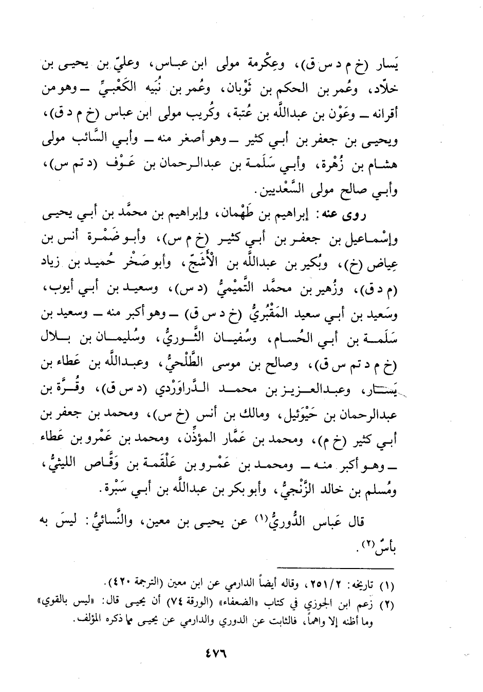 (2) زعم ابن الجوزي في كتاب"الضعفاء" (الورقة 74) أن يحيى قال: ليس بالقوي"وما أظنه إلا واهما، فالثابت عن الدوري والدارمي عن يحيى ما ذكره المؤلف.