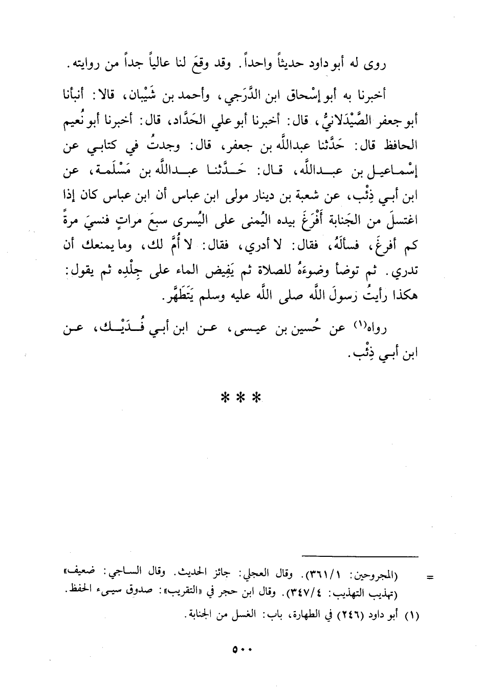 الحافظ قال: حَدَّثَنَا عَبد الله بْنُ جَعْفَرٍ، قال: وجَدْتُ فِي كِتَابِي عَنْ إِسْمَاعِيلَ بْنِ عَبد اللَّهِ، قال: حَدَّثَنَا عَبد اللَّهِ بْنُ مَسْلَمَةَ، عَنِ ابْنِ أَبي ذِئْبٍ، عَنْ شُعْبَةَ بْنِ دِينَارٍ مَوْلَى ابْنِ عَبَّاسٍ أَنَّ ابْنَ عَبَّاسٍ كَانَ إِذَا اغْتَسَلَ مِنَ الْجَنَابَةِ أَفْرَغَ بِيَدِهِ الْيُمَنَى عَلَى الْيُسْرَى سَبْعَ مَرَّاتٍ فَنَسِيَ مَرَّةً كَمْ أَفْرَغَ، فَسَأَلَهُ، فَقال: لا أَدْرِي، فَقال: لا أُمَّ لَكَ، ومَا يَمْنَعُكَ أَنْ تَدْرِي. ثُمَّ تَوَضَّأَ وضُوءَهُ لِلصَّلاةِ ثُمَّ يَفِيضُ الْمَاءَ عَلَى جِلْدِهِ ثُمَّ يَقُولُ: هَكَذَا رَأَيْتُ رَسُولَ اللَّهِ صَلَّى اللَّهُ عَلَيْهِ وسَلَّمَ يَتَطَهَّرُ.