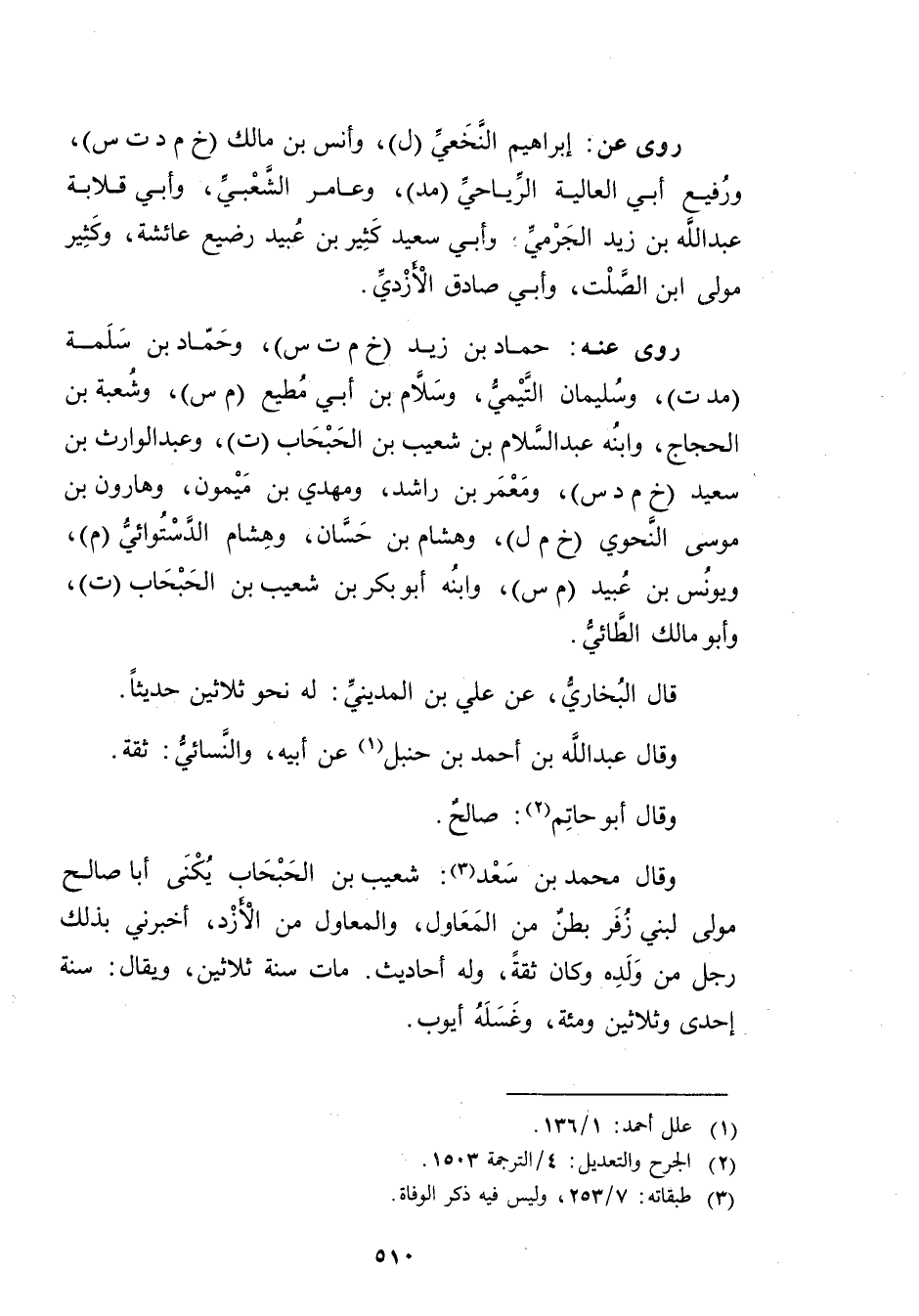 وَقَال مُحَمَّد بْن سعد (3) : شعيب بْن الحبحاب يكنى أبا صالح مولى لبني زفر بطن من المعاول، والمعاول من الأزد، أخبرني بذلك رجل من ولده وكَانَ ثقة، وله أحاديث. مات سنة ثلاثين، ويُقال: سنة إحدى وثلاثين ومئة، وغسله أيوب.
