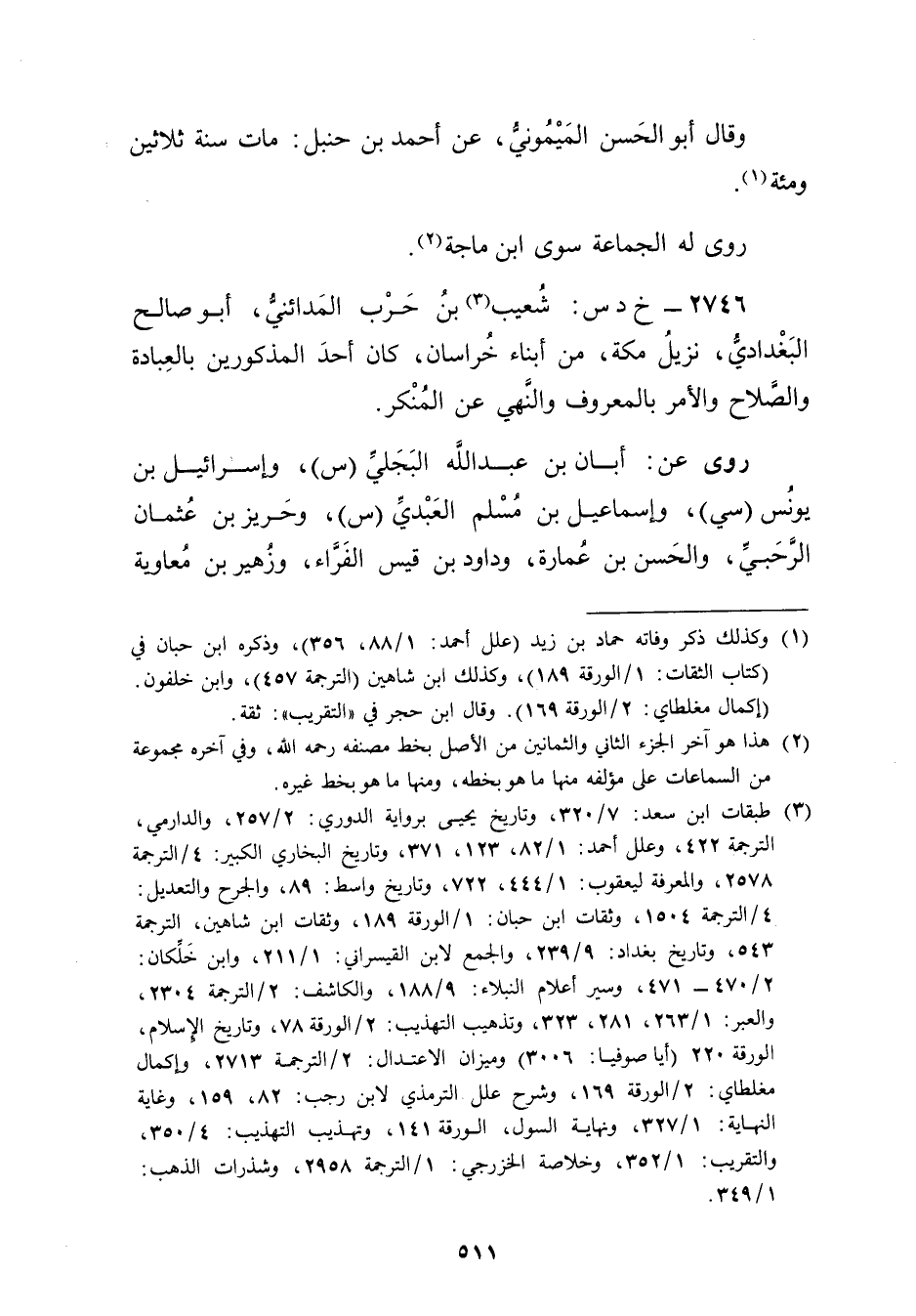 2746 - خ د س: شعيب بن حرب المدائيي (3) ، أَبُو صالح البغدادي، نزيل مكة، من أبناء خراسان، كَانَ أحد المذكورين بالعبادة والصلاح والأمر بالمعروف والنهي عَنِ المنكر.