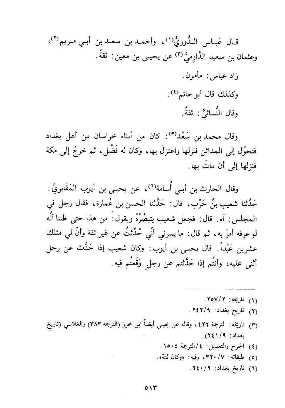 (3) تاريخه: الترجمة 422، وَقَاله عن يحيى أيضا ابن محرز (الترجمة 383) والغلابي (تاريخ بغداد: 9 / 241) .