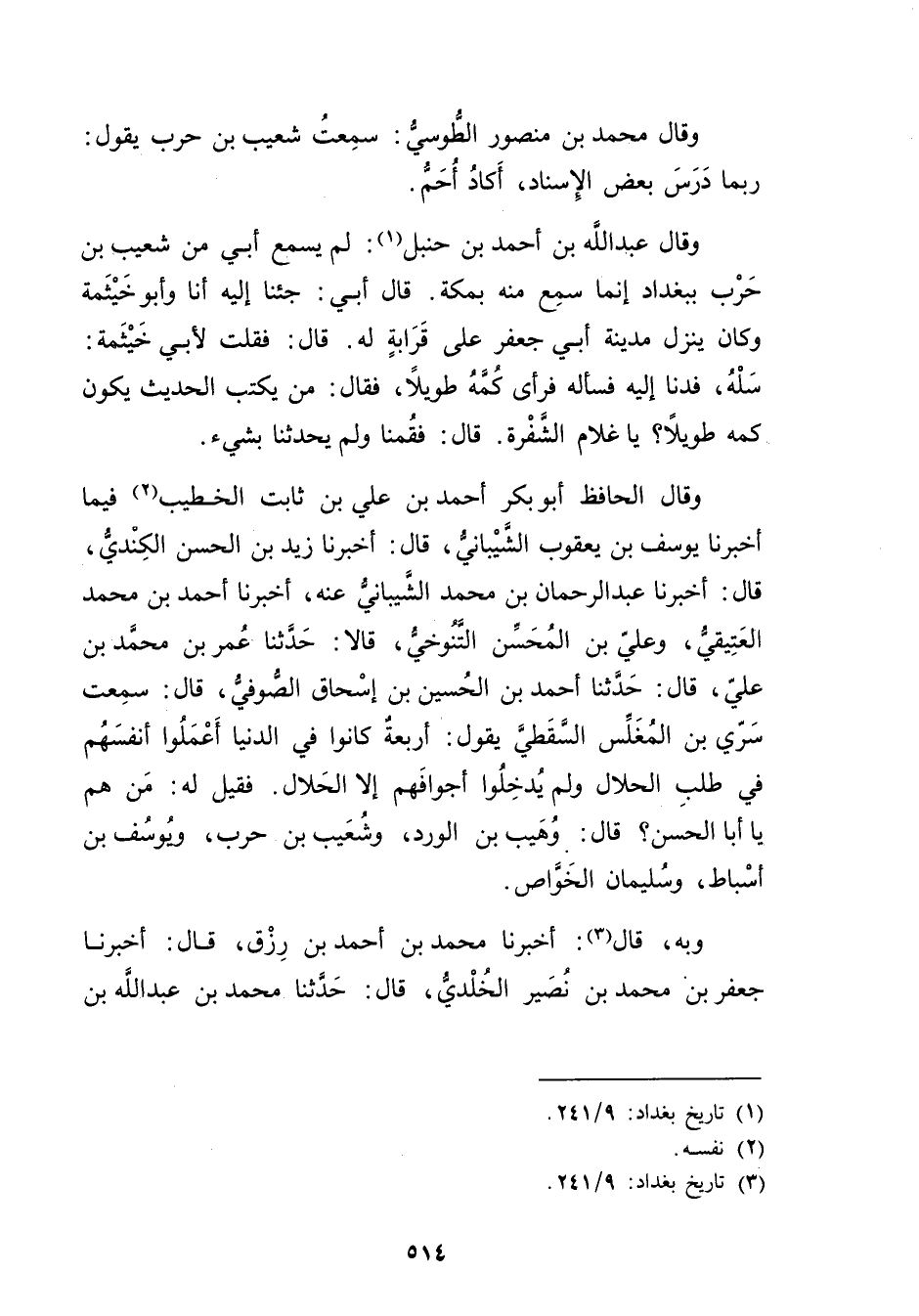 وَقَال الحافظ أبو بَكْر أَحْمَدُ بْنُ عَلِيِّ بْنِ ثَابِتٍ الْخَطِيبُ (2) فِيمَا أَخْبَرَنَا يُوسُفُ بْنُ يعقوب الشيباني، قال: أَخْبَرَنَا زيد بْن الحسن الكندي، قال: أَخْبَرَنَا عَبْد الرحمن بْن مُحَمَّد الشيباني عنه، أخبرنا أَحْمَد بْن مُحَمَّد العتيقي، وعلي بْن المحسن التنوخي، قالا: حَدَّثَنَا عُمَر بْن مُحَمَّد بْن علي، قال: حَدَّثَنَا أَحْمَد بْن الحسين بْن إسحاق الصوفي، قال: سمعت سري بْن المغلس السقطي يقول: أربعة كانوا فِي الدنيا اعملوا أنفسهم فِي طلب الحلال ولم يدخلوا أجوافهم إلا الحلال. فقيل له: من هم يا أبا الحسن؟ قال: وهيب بْن الورد، وشعيب بْن حرب، ويوسف بْن أسباط، وسُلَيْمان الخواص.