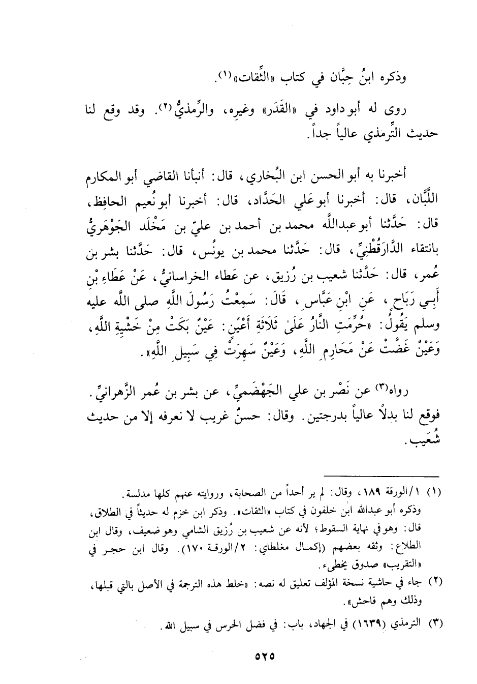 أَخْبَرَنَا بِهِ أَبُو الْحَسَنِ بْنُ الْبُخَارِيِّ، قال: أَنْبَأَنَا القاضي أَبُو المكارم اللبان، قال: أَخْبَرَنَا أَبُو عَلِيّ الحداد، قال: أَخْبَرَنَا أبو نعيم الحافظ، قال: حَدَّثَنَا أَبُو عَبْد اللَّهِ مُحَمَّد بْن أحمد بْن علي بْن مَخْلَدٍ الْجَوْهَرِيُّ بِانْتِقَاءِ الدَّارَقُطْنِيِّ، قال: حَدَّثَنَا مُحَمَّد بْن يونس، قال: حَدَّثَنَا بِشْرُ بْنُ عُمَر، قال: حَدَّثَنَا شُعَيْبُ بْنُ رُزَيْقٍ، عَنْ عَطَاءٍ الْخُرَاسَانِيِّ، عَنْ عَطَاءِ بْنِ أَبي رَبَاحٍ، عَنِ ابْنِ عَبَّاسٍ، قال: سَمِعْتُ رَسُولَ اللَّهِ صَلَّى اللَّهُ عَلَيْهِ وسَلَّمَ يَقُولُ: حُرِّمَتِ النَّارُ عَلَى ثَلاثَةِ أَعْيُنٍ: عَيْنٍ بَكَتْ مِنْ خَشْيَةِ اللَّهِ، وعَيْنٍ غَضَّتْ عَنْ مَحَارِمِ اللَّهِ، وعَيْنٍ سَهِرَتْ فِي سَبِيلِ اللَّهِ.