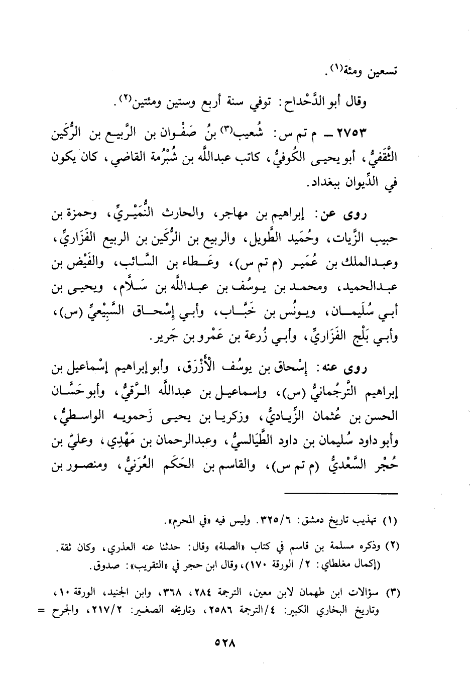 2753 - م تم س: شعيب بن صفوان بن الربيع بن الركين الثقفي (3) ، أبويحيى الكوفي، كاتب عَبد اللَّهِ بْن شبرمة القاضي، كَانَ يكون فِي الديوان ببغداد.
