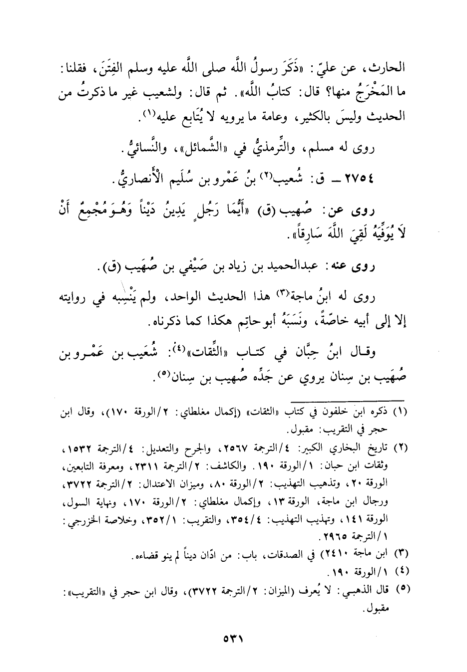 الْحَارِثِ، عَنْ عَلِيٍّ: ذَكَرَ رَسُولُ اللَّهِ صلى الله عليه وسلم الْفِتَنَ، فَقُلْنَا: مَا الْمَخْرَجُ مِنْهَا؟ قال: كِتَابُ اللَّهِ". ثم قال: ولشعيب غير ما ذكرت من الحديث وليس بالكثير، وعامة ما يرويه لا يتابع عليه (1) .
