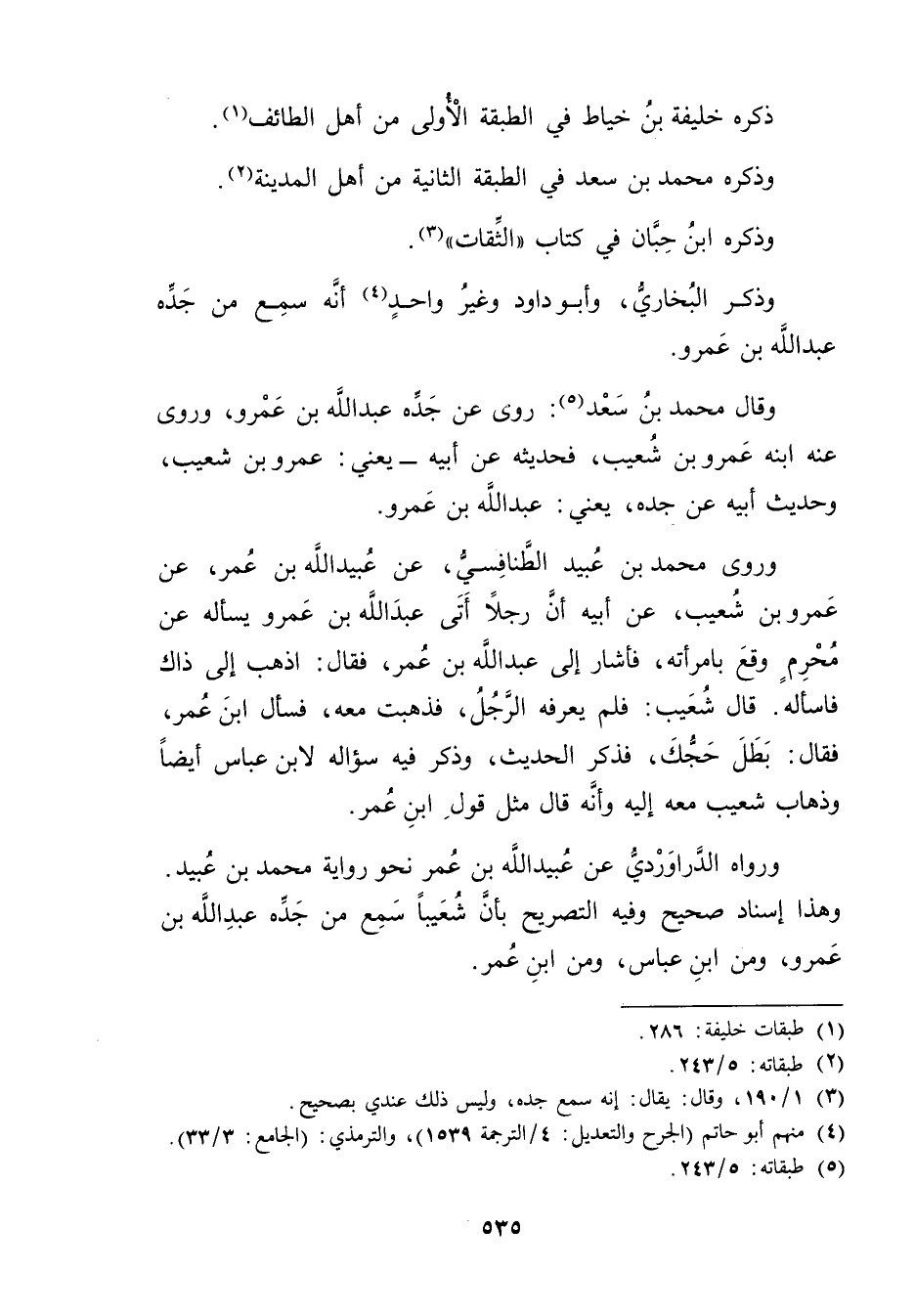 وَقَال مُحَمَّد بن سعد (5) : روى عن جده عَبد اللَّهِ بْن عَمْرو، وروى عنه ابنه عَمْرو بْن شعيب، فحديثه عَن أَبِيهِ، يعني: عَمْرو بْن شعيب، وحديث أَبِيهِ عَنْ جده، يعني: عَبد اللَّهِ بْن عَمْرو.