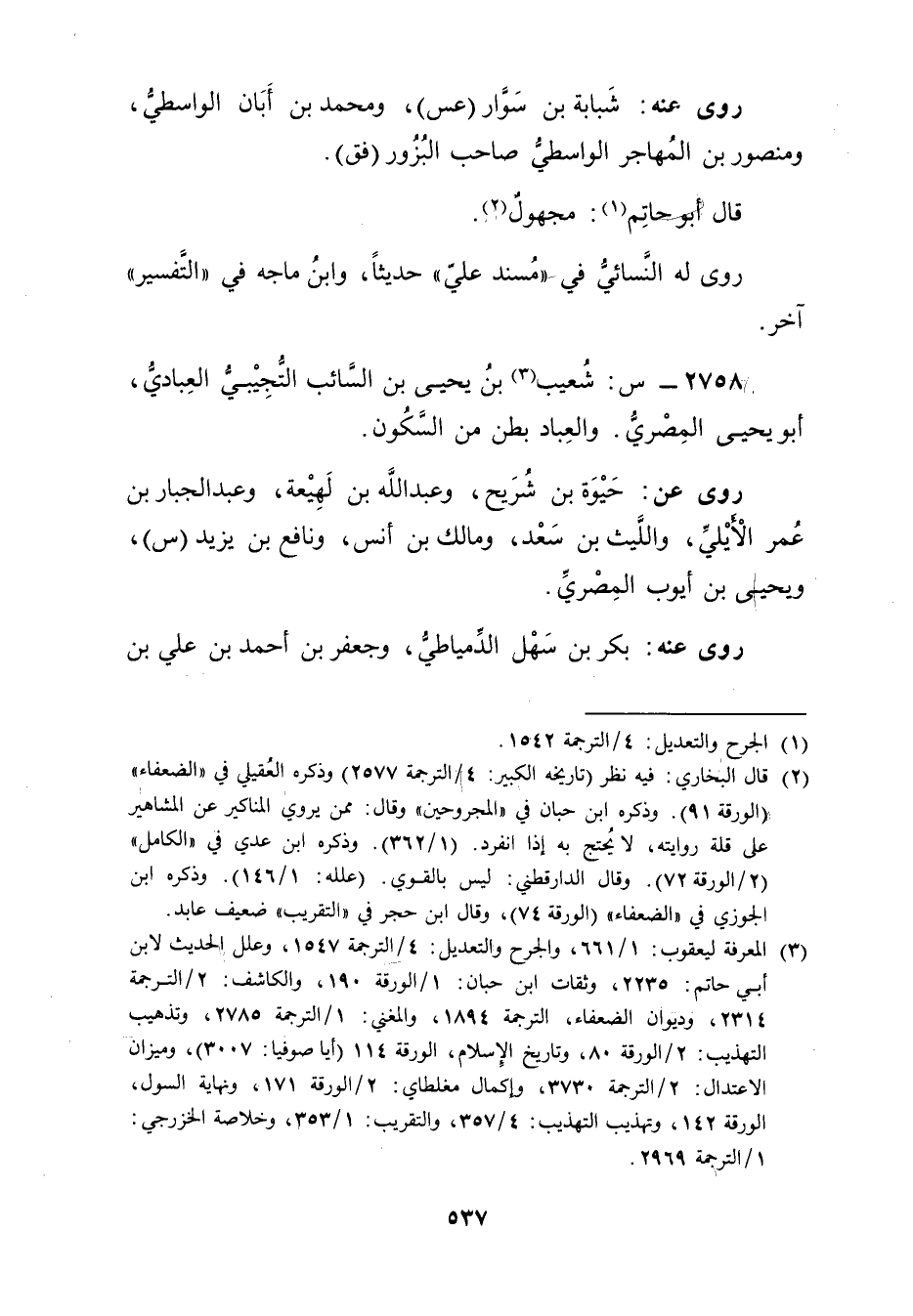 2758 - س: شعيب بن يحيى بن السائب التجيبي العبادي (3) ، أبويحيى المِصْرِي. والعباد بطن من السكون.
