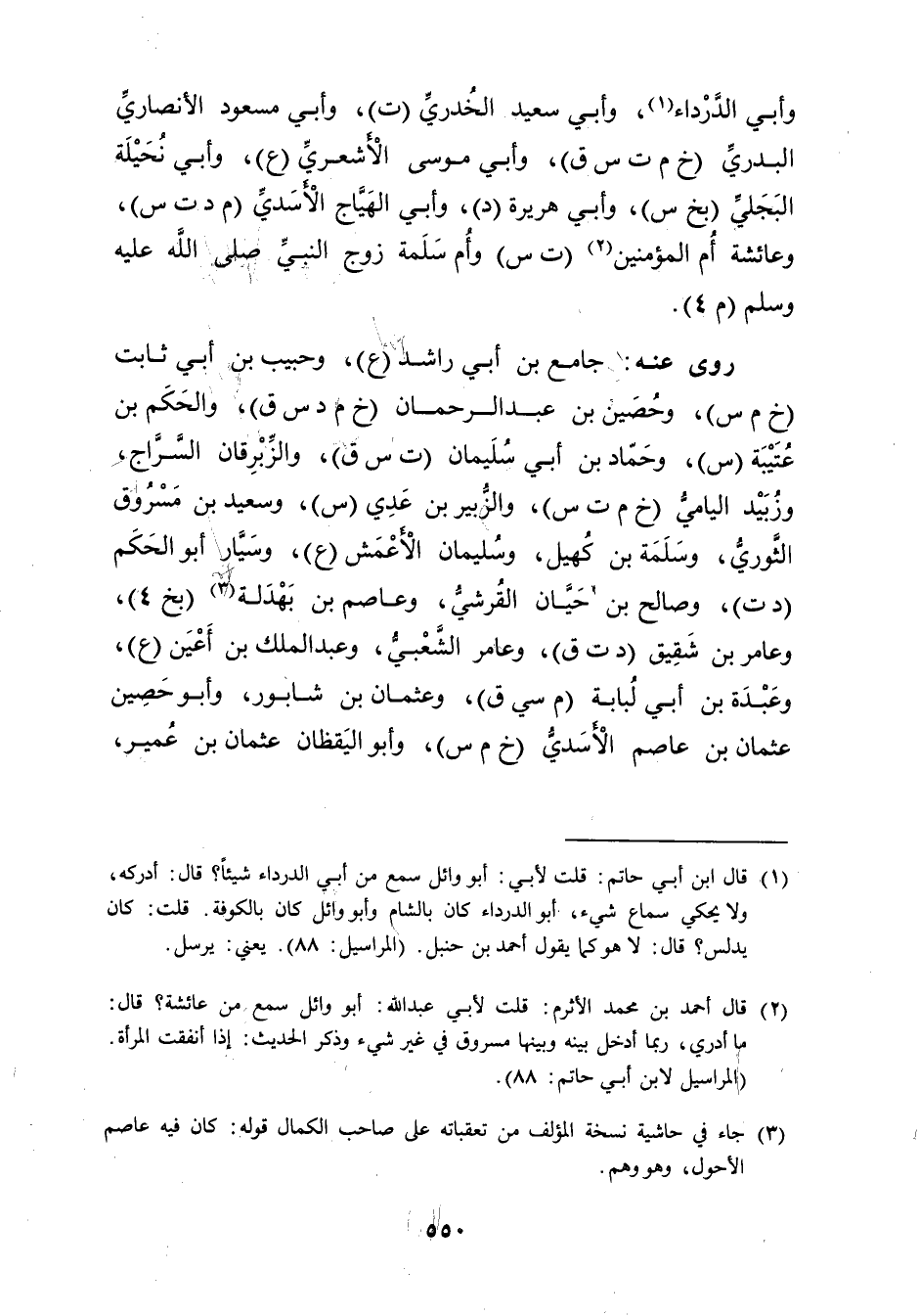 (1) قال ابن أَبي حاتم: قلتُ لأبي: أبو وائل سمع من أَبي الدَّرْدَاء شيئا؟ قال: أدركه، ولا يحكي سماع شيء، أبو الدرداء كان بالشام وأبو وائل كان بالكوفة. قلت: كان يدلس؟ قال: لا هو كما يقول أحمد بن حنبل.