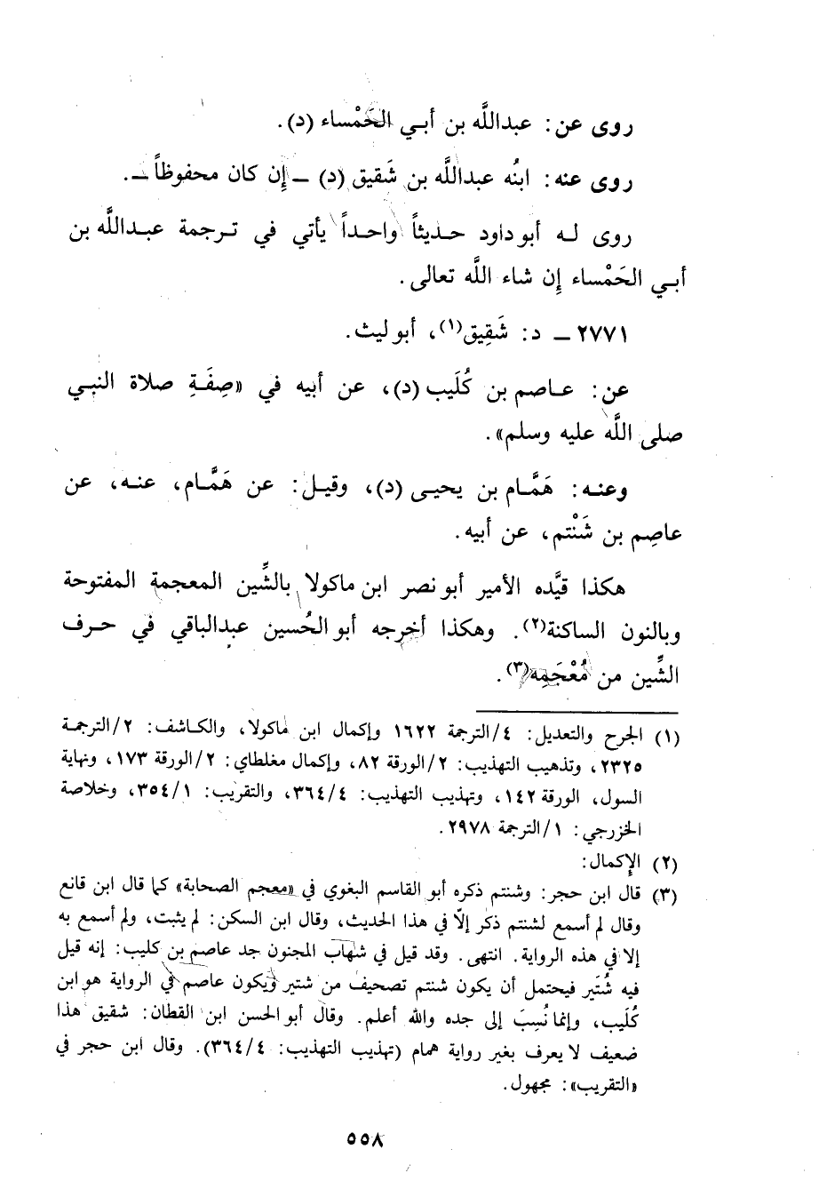 (3) قال ابن حجر: وشنتم ذكره أبو القاسم البغوي في "معجم الصحابة"كما قال ابن قانع وَقَال لم أسمع لشنتم ذكر إلا فِي هذا الحديث، وَقَال ابن السكن: لم يثبت، ولم أسمع به إلا في هذه الرواية. انتهى. وقد قيل في شهاب المجنون جد عاصم بن كليب: إنه قيل فيه شتير فيحتمل أن يكون شنتم تصحيف من شتير ويكون عاصم في الرواية هو ابن كليب، وإنما نسب إلى جَدِّه والله أعلم. وَقَال أبو الحسن بن القطان: شقيق هذا ضعيف لا يعرف بغير رواية همام (تهذيب التهذيب: 4 / 364) . وَقَال ابن حجر في "التقريب": مجهول.