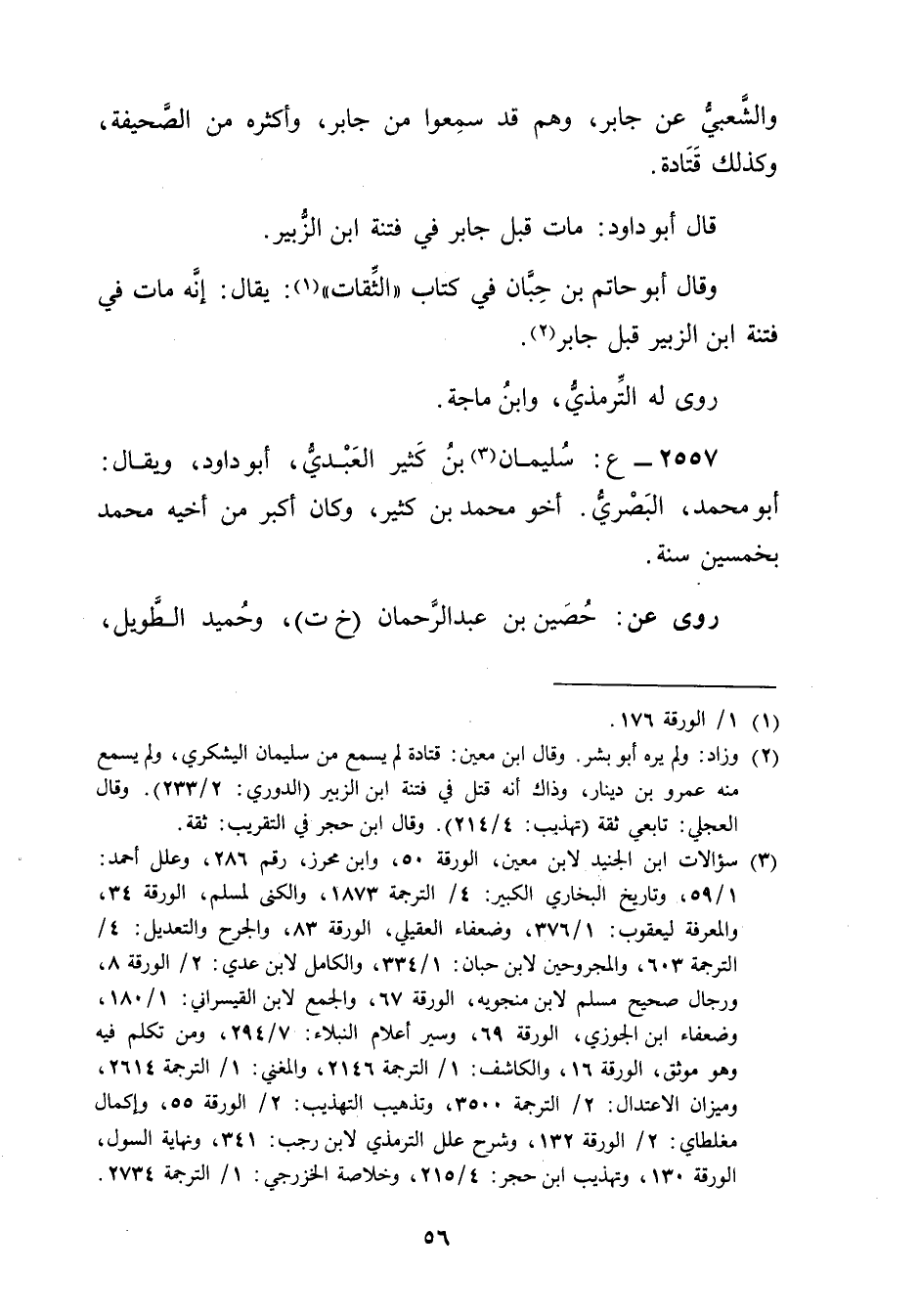 (3) سؤالات ابن الجنيد لابن مَعِين، الورقة 50، وابن محرز، رقم 286، وعلل أحمد: 1 / 59، وتاريخ البخاري الكبير: 4 / الترجمة 1873، والكنى لمسلم، الورقة 34، والمعرفة ليعقوب: 1 / 376، وضعفاء العقيلي، الورقة 83، والجرح والتعديل: 4 / الترجمة 603، والمجروحين لابن حبان: 1 / 334، والكامل لابن عدي: 2 / الورقة 8، ورجال صحيح مسلم لابن منجويه، الورقة 67، والجمع لابن القيسراني: 1 / 180، وضعفاء ابن الجوزي، الورقة 69، وسير أعلام النبلاء: 7 / 294، ومن تكلم فيه وهو موثق، الورقة 16، والكاشف: 1 / الترجمة 2146، والمغني: 1 / الترجمة 2614، وميزان الاعتدال: 2 / الترجمة 3500، وتذهيب التهذيب: 2 / الورقة 55، وإكمال مغلطاي: 2 / الورقة 132، وشرح علل التِّرْمِذِيّ لابن رجب: 341، ونهاية السول، الورقة 130، وتهذيب ابن حجر: 4 / 215، وخلاصة الخزرجي: 1 / الترجمة 2734.