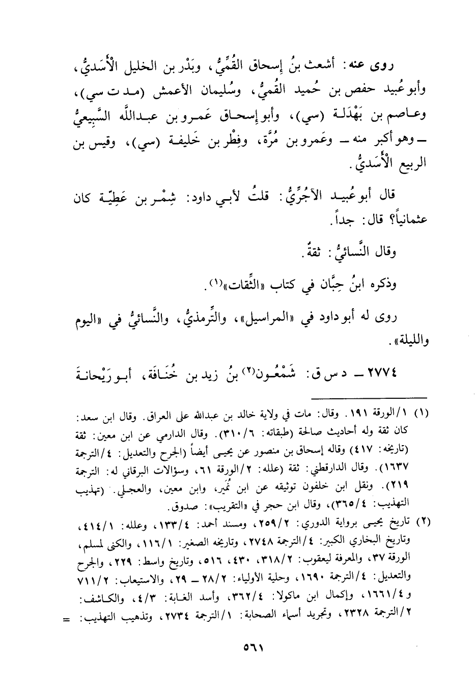 (1) 1 / الورقة 191. وَقَال: مَاتَ فِي ولاية خَالِد بن عَبد اللَّهِ على العراق. وَقَال ابن سعد: كان ثقة وله أحاديث صالحة (طبقاته: 6 / 310) . وَقَال الدارمي عن ابن مَعِين: ثقة (تاريخه: 417) وَقَاله إسحاق بْن منصور عَن يحيى أيضا (الجرح والتعديل: 4 / الترجمة 1637) .
