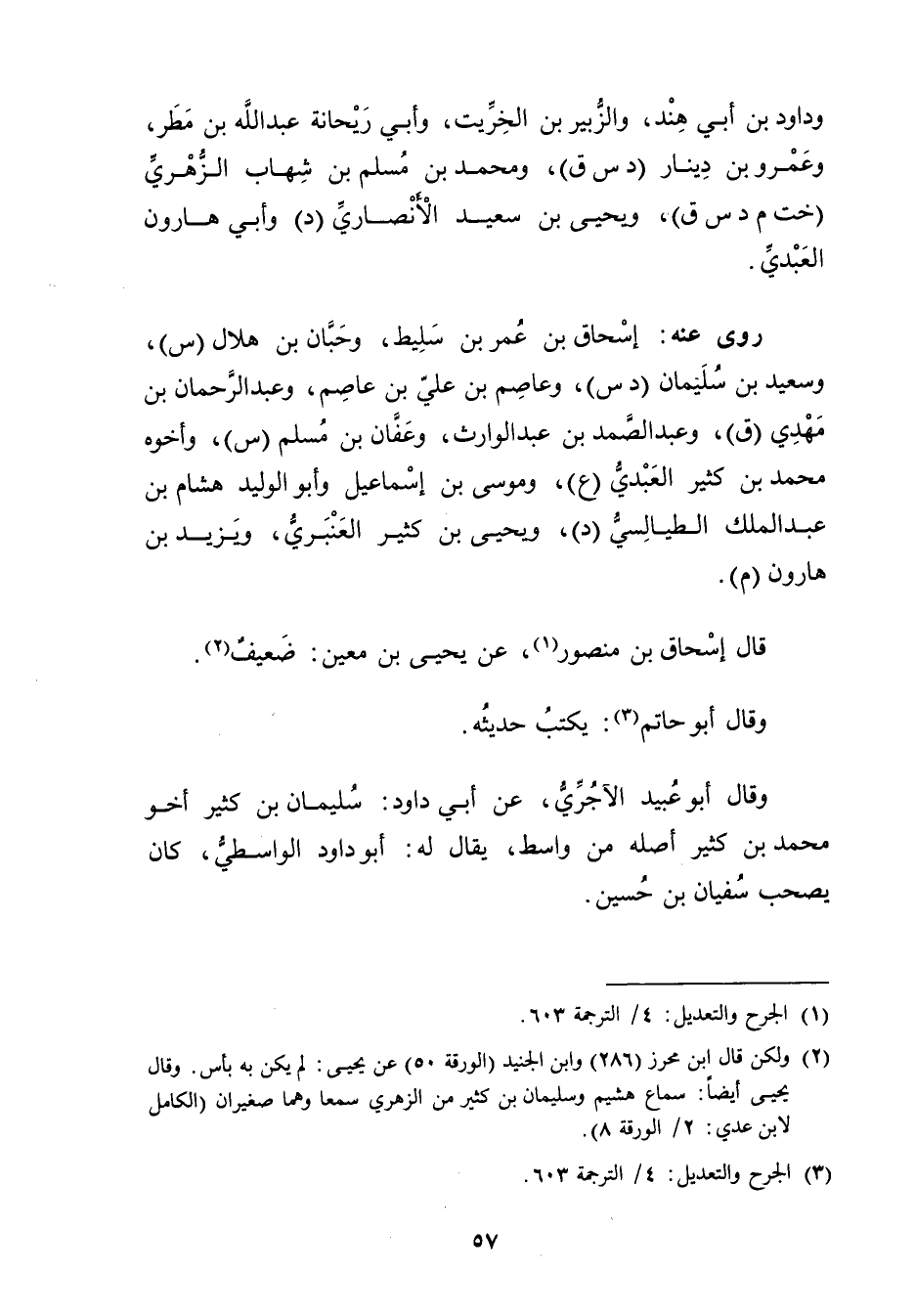 (2) ولكن قال ابن محرز (286) وابن الجنيد (الورقة 50) عن يَحْيَى: لم يكن به بأس. وَقَال يحيى أيضا: سماع هشيم وسُلَيْمان بن كثير من الزُّهْرِيّ سمعا وهما صغيران (الكامل لابن عدي: 2 / الورقة 8) .