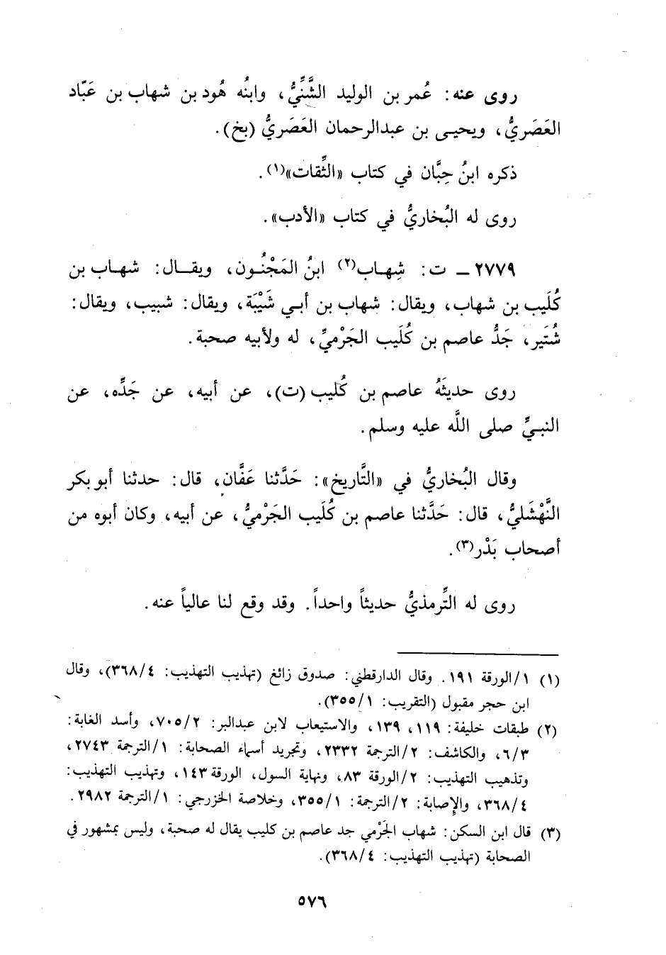 (3) قال ابن السكن: شهاب الجرمي جد عاصم بن كليب يقال لهُ صُحبَةٌ، وليس بمشهور في الصحابة (تهذيب التهذيب: 4 / 368) .