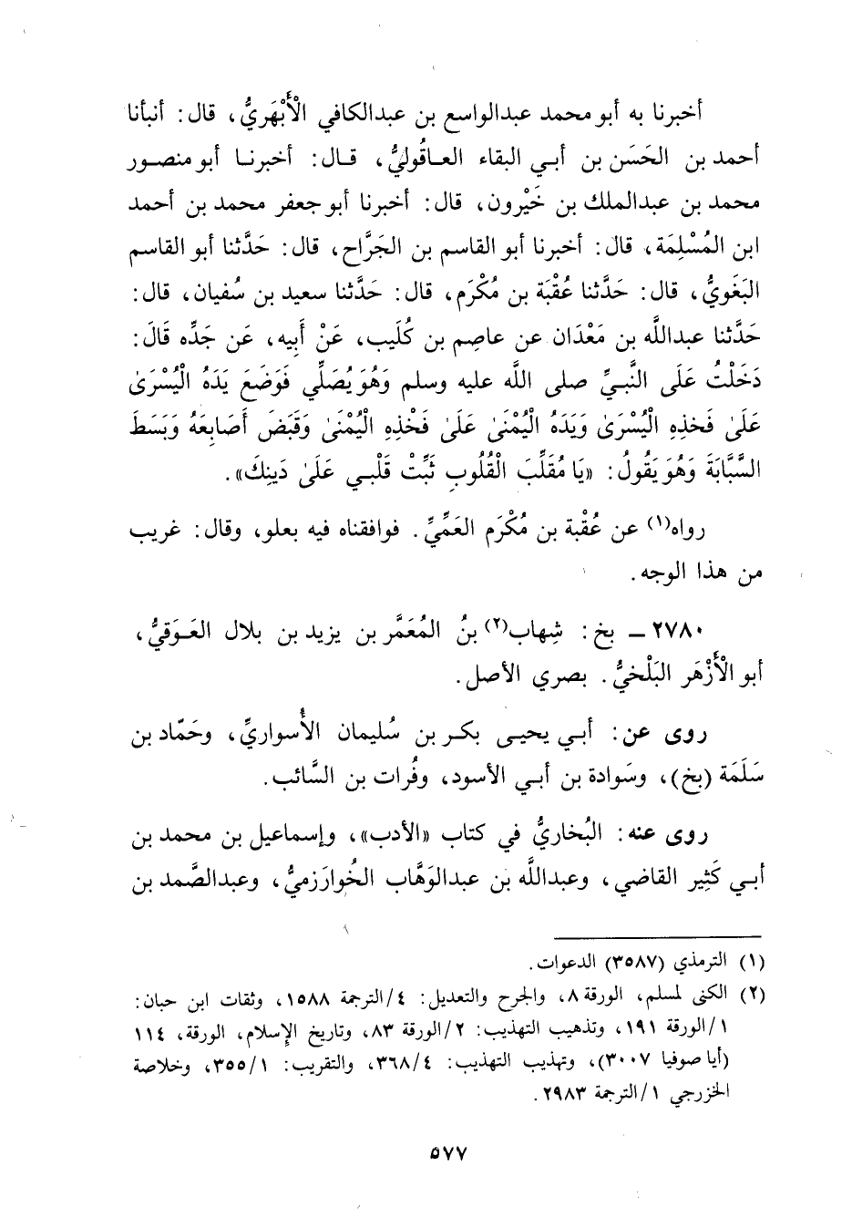 أَخْبَرَنَا بِهِ أَبُو مُحَمَّدٍ عَبْدُ الواسع بْن عَبْدِ الكافي الأبهري، قال: أَنَبَأَنَا أَحْمَدُ بْنُ الْحَسَنِ بْنِ أَبي الْبَقَاءِ الْعَاقُولِيُّ، قال: أَخْبَرَنَا أَبُو مَنْصُورٍ مُحَمَّدُ بْنُ عَبد المَلِك بْنِ خَيْرُونَ، قال: أَخْبَرَنَا أَبُو جَعْفَرٍ مُحَمَّدُ بْنُ أَحْمَدَ بْنِ المسلمة، قال: أَخْبَرَنَا أَبُو الْقَاسِمِ بْنُ الْجَرَّاحِ، قال: حَدَّثَنَا أبو القاسم البغوي، قال: حَدَّثَنَا عُقْبَةُ بْنُ مُكْرَمٍ، قال: حَدَّثَنَا سَعِيد بْنُ سُفْيَانَ، قال: حَدَّثَنَا عَبد اللَّهِ بْنُ مَعْدَانَ عَنْ عَاصِمِ بْنِ كُلَيْبٍ، عَن أَبِيهِ، عَنْ جَدِّهِ قال: دَخَلْتُ على النَّبِيّ صَلَّى اللَّهُ عليه وسَلَّمَ وهُوَ يُصَلِّي فَوَضَعَ يَدَهُ الْيُسْرَى عَلَى فَخِذِهِ الْيُسَرى ويَدَهُ البمنى عَلَى فَخِذِهِ الْيُمْنَى وقَبَضَ أَصَابِعَهُ وبَسَطَ السَّبَّابَةَ وهُوَ يَقُولُ: يَا مُقَلِّبَ الْقُلُوبِ ثَبِّتْ قَلْبِي عَلَى دِينِكَ.