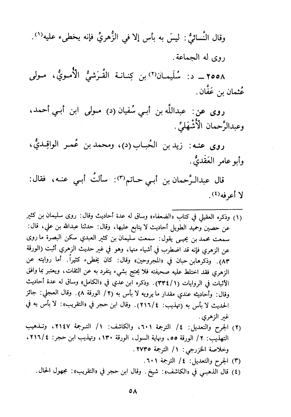 (2) الجرح والتعديل: 4 / الترجمة 601، والكاشف: 1 / الترجمة 2147، وتذهيب التهذيب: 2 / الورقة 55، ونهاية السول، الورقة 130، وتهذيب ابن حجر: 4 / 216، وخلاصة الخزرجي: 1 / الترجمة 2735.