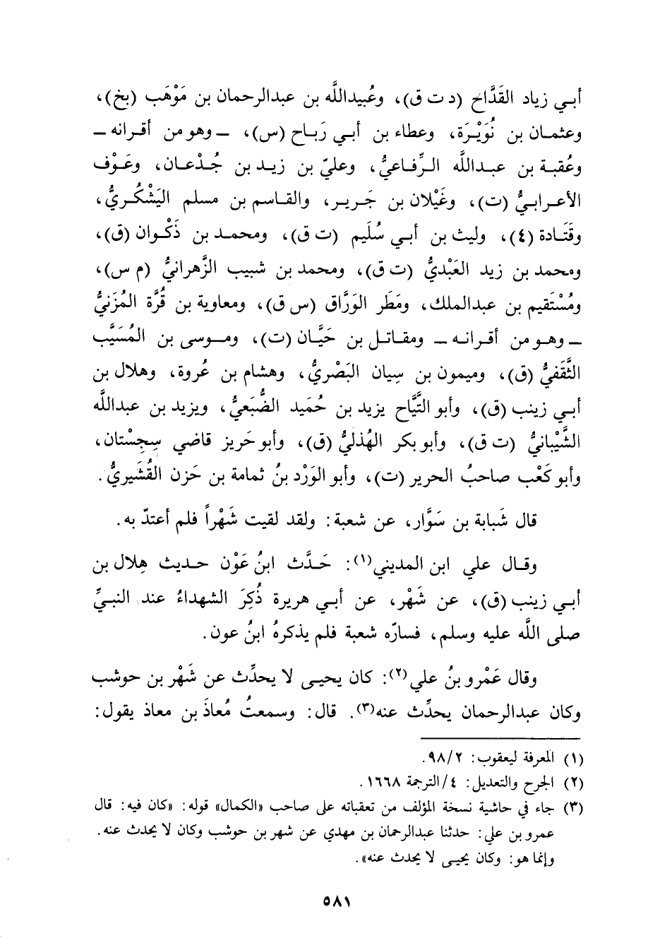 (3) جاء في حاشية نسخة المؤلف من تعقباته على صاحب "الكمال" قوله: كان فيه: قال عَمْرو بْن عَلِيٍّ: حَدَّثَنَا عَبْد الرحمن بْن مهدي عَن شهر بن حوشب وكان لا يحدث عنه. وإنما هو: وكان يحيى لا يحدث عنه".