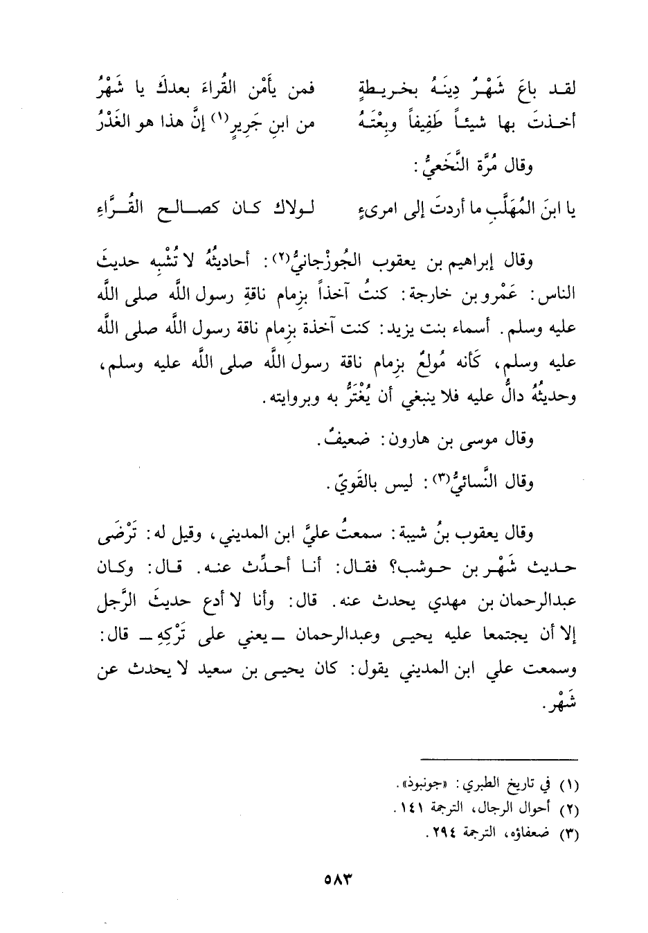 وَقَال يعقوب بْن شَيْبَة: سمعت علي ابن المديني، وقيل له: ترضى حديث شهر بْن حوشب؟ فقال: أنا أحدث عنه. قال: وكَانَ عَبْد الرَّحْمَنِ بْن مهدي يحدث عنه. قال: وأنا لا ادع حديث الرجل إلا أن يجتمعا عليه يحيى وعَبْد الرحمن، يعني على تركه، قال: وسمعت علي ابن المديني يقول: كَانَ يحيى بْن سَعِيد لا يحدث عَنْ شهر.