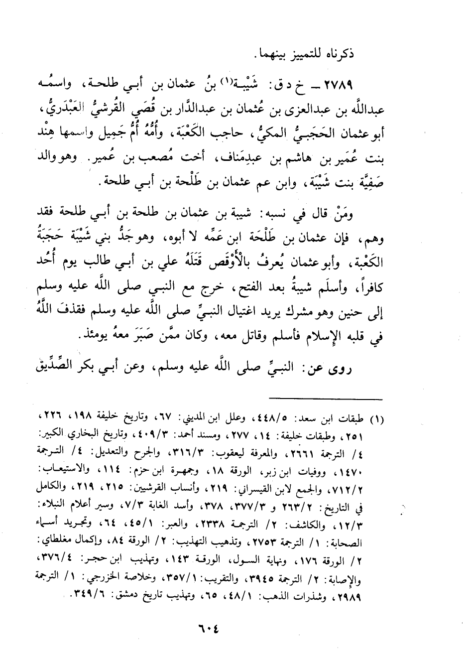 2789 - خ د ق: شَيْبَة بن عُثْمَانَ بن أَبي طلحة (1) ، واسمه عَبد اللَّهِ بن عبد العزى بْن عثمان بْن عبد الدار بْن قصي القرشي العبدري، أَبُو عثمان الحجبي المكي، حاجب الكعبة، وأمه أم جميل واسمها هند بنت عُمَير بْن هاشم بْن عَبْد مناف، أخت مصعب بْن عمير. وهو والد صفية بنت شَيْبَة، وابن عم عُثْمَان بْن طلحة بْن أَبي طلحة.