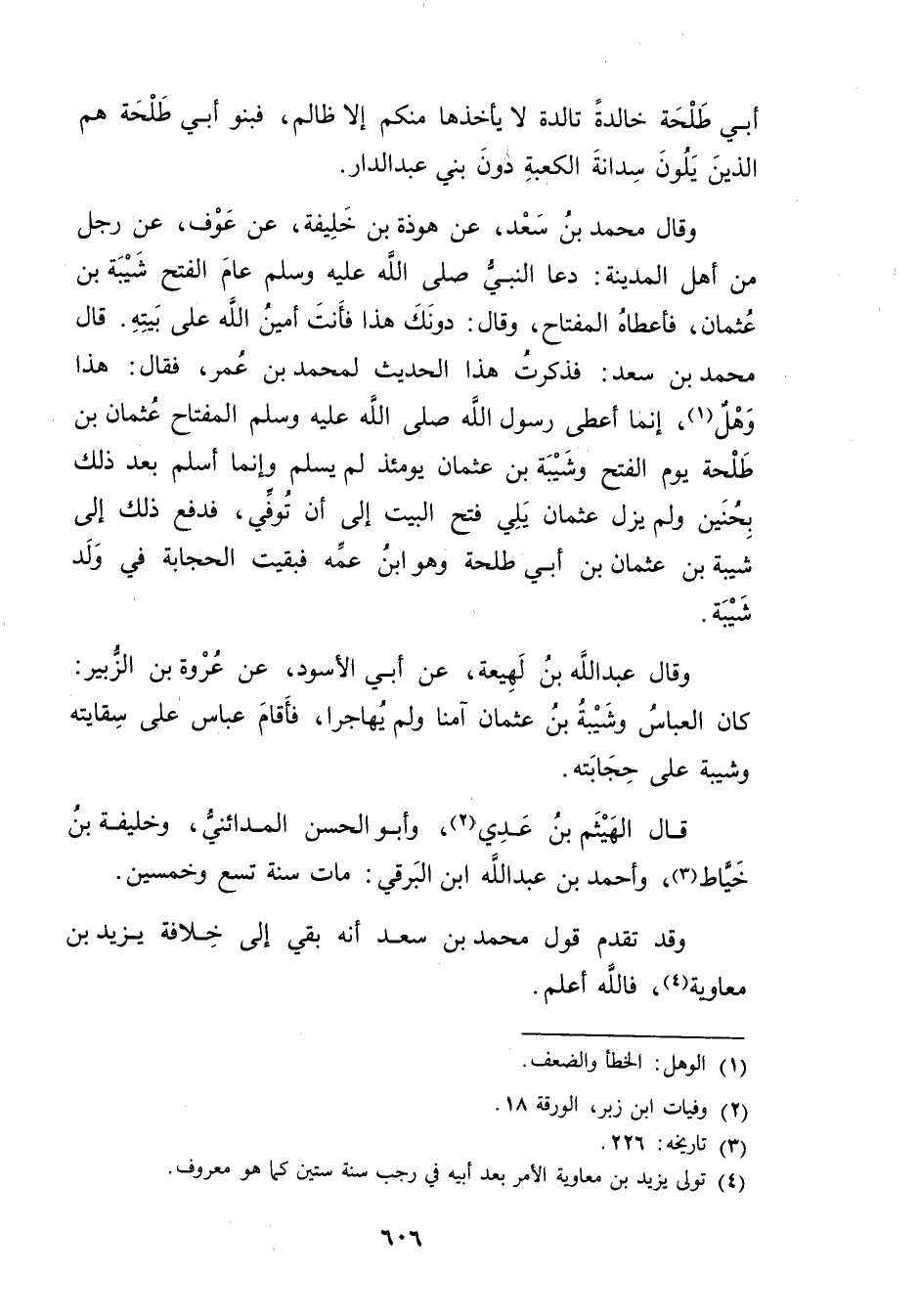 وَقَال مُحَمَّدُ بْنُ سَعْدٍ، عَنْ هَوْذَةَ بْنِ خَلِيفَةَ، عَنْ عَوْفٍ، عَنْ رَجُلٍ مِنْ أَهْلِ الْمَدِينَةِ: دَعَا النَّبِيُّ صَلَّى اللَّهُ عَلَيْهِ وسَلَّمَ عَامَ الْفَتْحِ شَيْبَة بْنَ عُثْمَانَ، فَأَعْطَاهُ الْمِفْتَاحَ، وَقَال: دُونَكَ هَذَا فَأَنْتَ أَمِينُ اللَّهِ عَلَى بَيْتِهِ. قال مُحَمَّد بْن سعد: فذكرت هذا الحديث لمحمد بْن عُمَر، فقال: هذا وهل (1) ، إنما أعطى رَسُول اللَّه صَلَّى اللَّهُ عَلَيْهِ وسَلَّمَ المفتاح عُثْمَان بْن طلحة يوم الفتح وشَيْبَة بْن عُثْمَانَ يومئذ لم يسلم وإنما أسلم بعد ذلك بحنين ولم يزل عُثْمَان يلي فتح البيت إلى أن توفي، فدفع ذلك إلى شَيْبَة بْن عُثْمَانَ بْن أَبي طلحة وهو ابن عمه فبقيت الحجابة فِي ولد شَيْبَة.