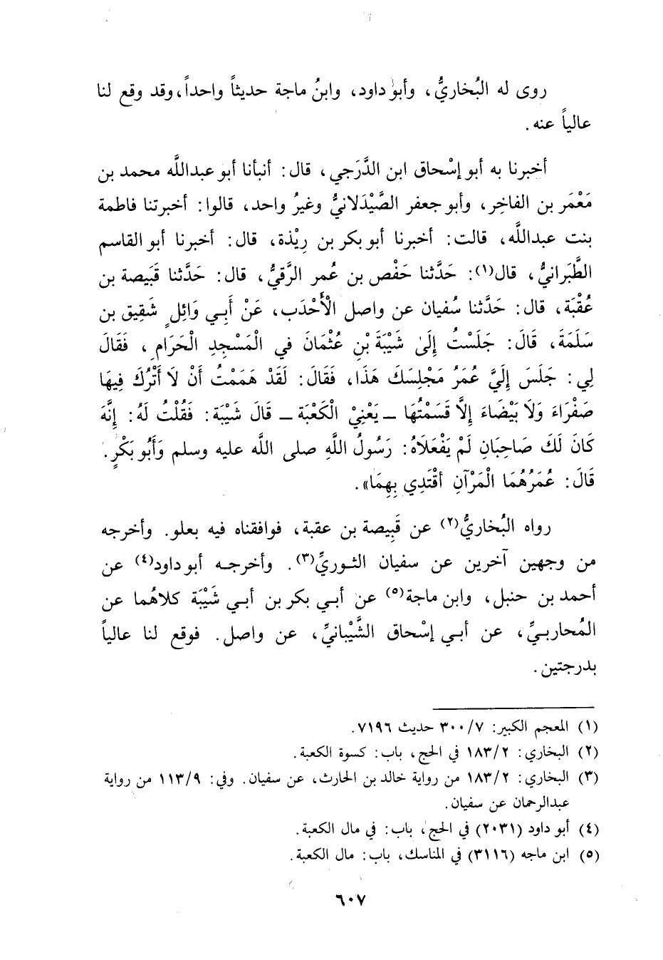عُقْبَةَ، قال: حَدَّثَنَا سُفْيَانُ عَنْ واصِلٍ الأَحْدَبِ، عَن أبي وائل شقيق بْن سلمة، قال: جَلَسْتُ إِلَى شَيْبَة بْنِ عُثْمَانَ فِي الْمَسْجِدِ الْحَرَامِ، فَقال لِي: جَلَسَ إِلَيَّ عُمَر مَجْلِسَكَ هَذَا، فَقال: لَقَدْ هَمَمْتُ أَنْ لا أَتْرُكَ فِيهَا صَفْرَاءَ ولا بَيْضَاءَ إِلا قَسَمْتُهَا، يَعْنِي الْكَعْبَةَ، قال شَيْبَة: فَقُلْتُ لَهُ: إِنَّهُ كَانَ لَكَ صَاحِبَانِ لَمْ يَفْعَلاهُ: رَسُول اللَّهِ صلى الله عليه وسلم وأبو بكر. قال: عُمَرهما الْمَرْآنِ أَقْتَدِي بِهِمَا.