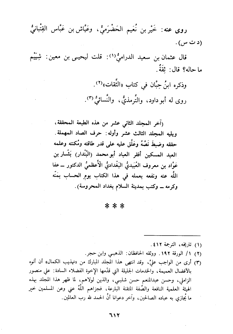 (3) أرى من الواجب علي، وقد انتهى هذا المجلد المبارك من"تهذيب الكمال"أن أنوه بالافضال العميمة، والخدمات الجليلة التي قدمها الأَخُوة الفضلاء السادة: علي منصور الزاملي، وحسن عبد المنعم حسن شلبي، والذين لولاهم، لما ظهر هذا المجلد بهذه الهيئة العلمية النافعة والصفة المتقنة البارعة، فجزاهم الله عني وعن المسلمين خير ما يجازي به عباده الصالحين، وآخر دعوانا أن الحمد لله رب العالمين.
