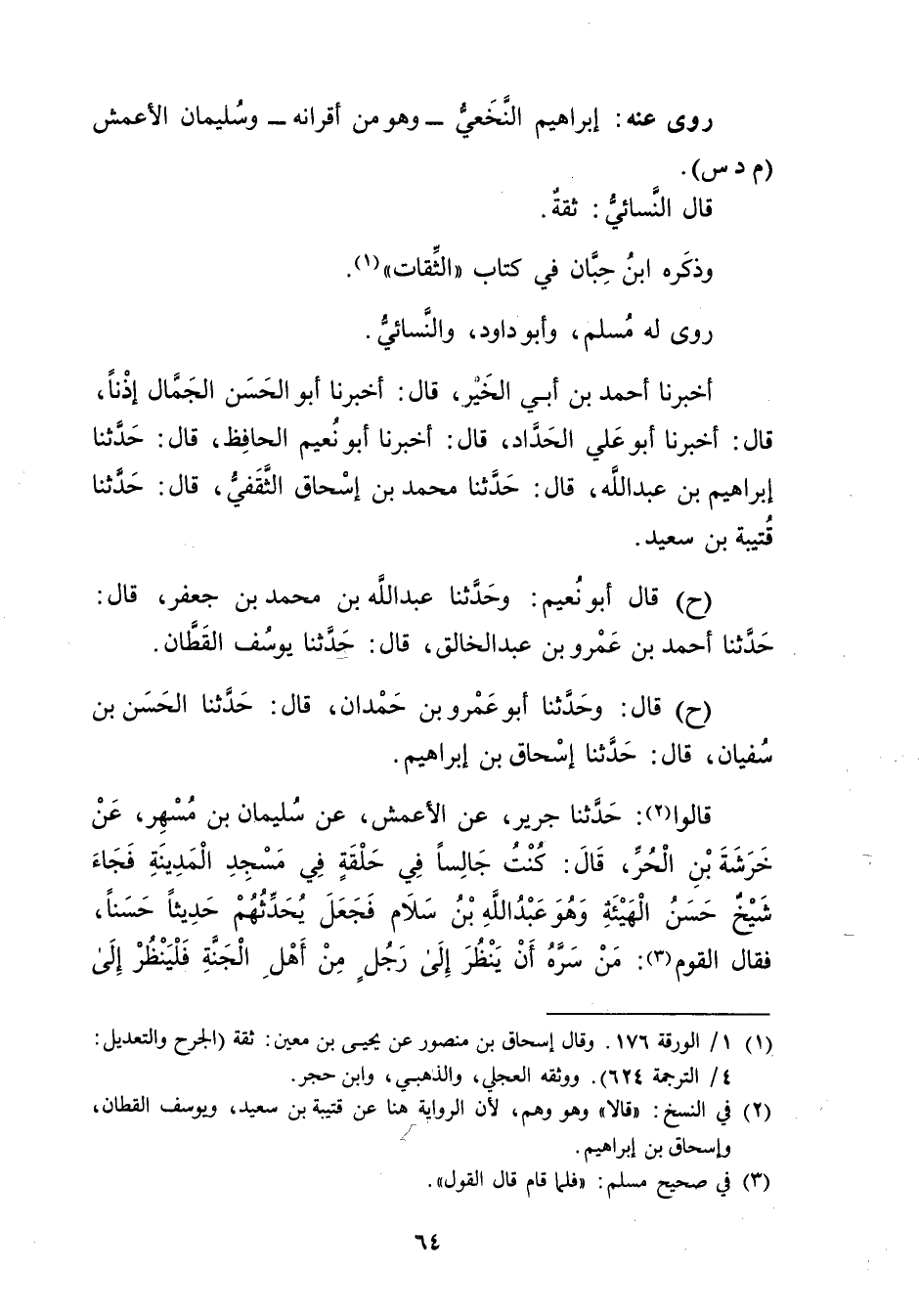 أخبرنا أَحْمَد بْن أَبي الخير، قال: أخبرنا أَبُو الحسن الجمال إذنا، قال: أخبرنا أَبُو عَلِيّ الحداد، قال: أَخْبَرَنَا أَبُو نعيم الحافظ، قال: حَدَّثَنَا إبراهيم بْن عَبد اللَّهِ، قال: حَدَّثَنَا مُحَمَّد بْن إِسْحَاق الثَّقَفِيّ، قال: حَدَّثَنَا قُتَيْبَةُ بْنُ سَعِيد.
