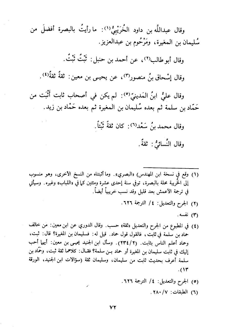 (4) في المطبوع من الجرح والتعديل"ثقة"حسب. وَقَال الدوري عن ابن مَعِين: من خالف حماد بن سلمة في ثابت، فالقول قول حماد. قيل له: فسُلَيْمان بن المغيرة؟ قال: ثبت، وحماد أعلم الناس بثابت. (2 / 234) .