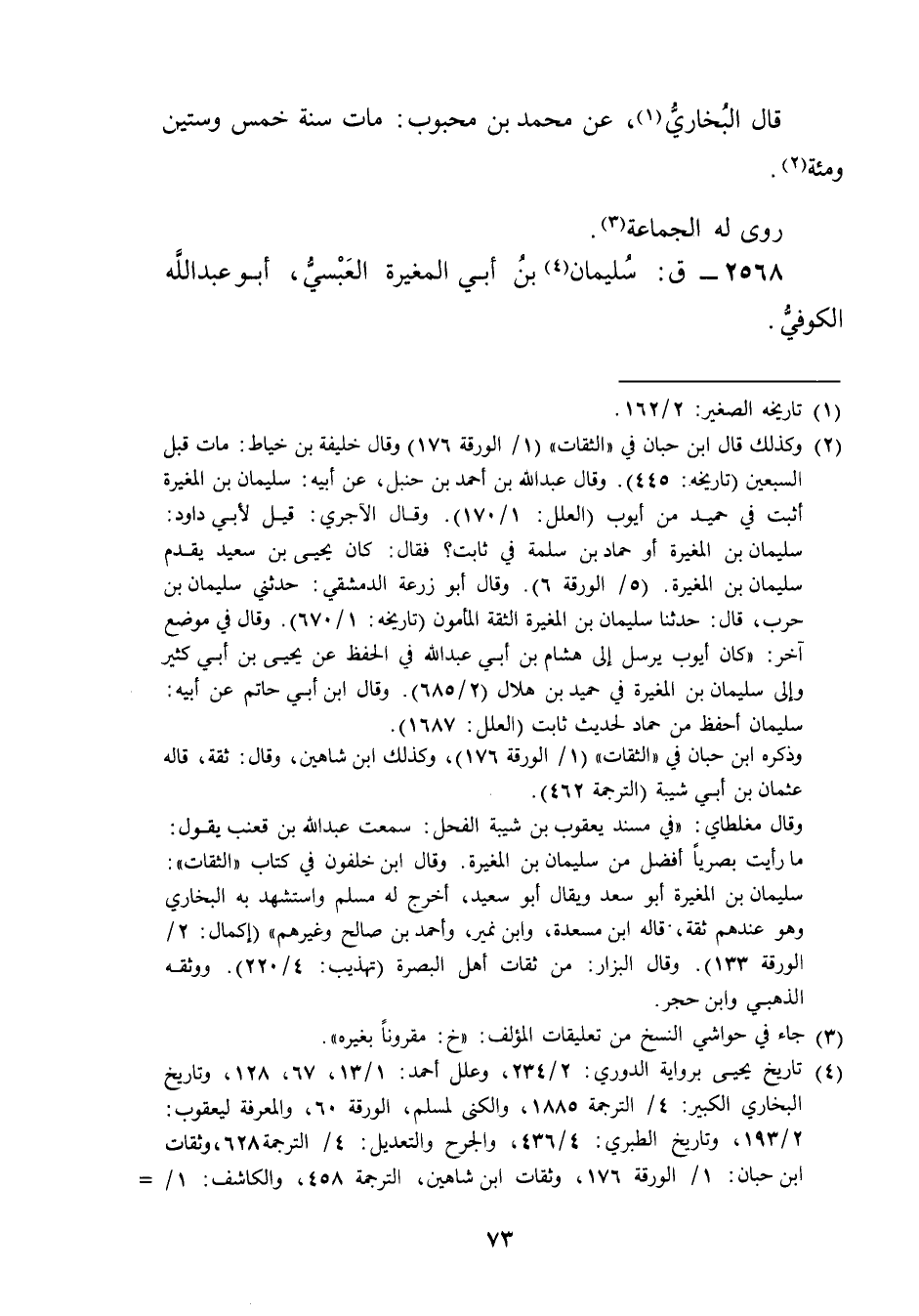 (2) وكذلك قال ابن حبان في "الثقات" (1 / الورقة 176) وَقَال خليفة بْن خياط: مات قبل السبعين (تاريخه: 445) . وَقَال عَبد الله بن أحمد بن حنبل، عَن أبيه: سُلَيْمان بن المغيرة أثبت في حميد من أيوب (العلل: 1 / 170) . وَقَال الآجري: قيل لابي داود: سُلَيْمان بن المغيرة أو حماد بن سلمة في ثابت؟ فقال: كان يحيى بن سَعِيد يقدم سُلَيْمان بن المغيرة.