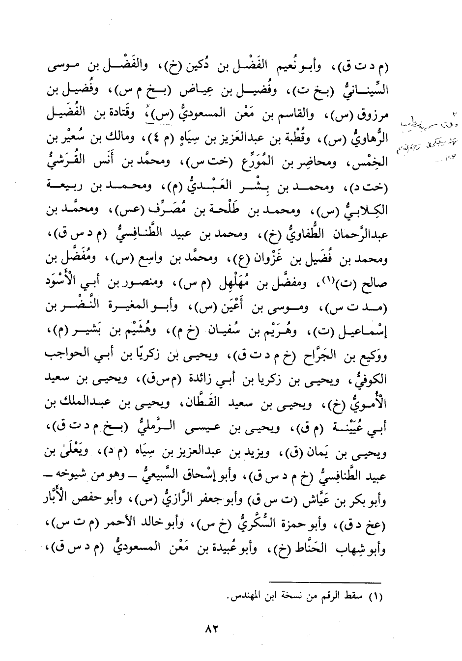 (م د ت ق) ، وأَبُو نعيم الْفَضْل بْن دكين (خ) ، والفضل بْن مُوسَى السيناني (بخ ت) ، وفضيل بْن عياض (بخ م س) ، وفضيل بْن مرزوق (س) ، والقاسم بْن معن المسعودي (س) ، وقتادة بْن الفضيل الرهاوي (س) ، وقطبة بْن عَبْد العزيز بْن سياه (م 4) ، ومالك بْن سعير بْن الخمس، ومحاضر بْن المورع (خت س) ، ومحمد بْن أنس القرشي (خت د) ، ومحمد بْن بشر العبدي (م) ، ومحمد بْن ربيعة الكِلابي (س) ، ومحمد بْن طلحة بْن مصرف (عس) ، ومحمد بْن عَبْد الرَّحْمَنِ الطفاوي (خ) ، ومُحَمَّد بْن عُبَيد الطنافسي (م د س ق) ، ومحمد بْن فضيل بْن غزوان (ع) ، ومحمد بْن واسع (س) ، ومفضل بْن صالح (ت) (1) ، ومفضل بْن مهلهل (م س) ، ومنصور بْن أَبي الأسود (مد ت س) ، وموسى بْن أعين (س) ، وأَبُو المغيرة النضر بْن إسماعيل (ت) ، وهريم بْن سُفْيَان (خ م) ، وهشيم بْن بشير (م) ، ووكيع بْن الجراح (خ م د ت ق) ، ويحيى بْن زَكَرِيَّا بْن أَبي الحواجب الكوفي، ويحيى بْن زكريا بْن أَبي زائدة (م س ق) ، ويحيى بْن سَعِيد الأُمَوِي (خ) ، ويحيى بْن سَعِيد القطان، ويحيى بْن عَبد المَلِك بْن أَبي عُيَيْنَة (م ق) ، ويحيى بْن عِيسَى الرملي (بخ م د ت ق) ، ويحيى بْن يمان (ق) ، ويزيد بْن عَبْد العزيز بْن سياه (م د) ، ويَعْلَى بْن عُبَيد الطنافسي (خ م د س ق) ، وأبو إسحاق السبيعي - وهو من شيوخه - وأَبُو بَكْرِ بْنُ عياش (ت س ق) وأبو جعفر الرازي (س) ، وأَبُو حفص الأبار (عخ د ق) ، وأَبُو حمزة السكري (خ س) ، وأَبُو خالد الأحمر (م ت س) ، وأَبُو شهاب الحناط (خ) ، وأَبُو عُبَيدة بْن معن المسعودي (م د س ق) ،