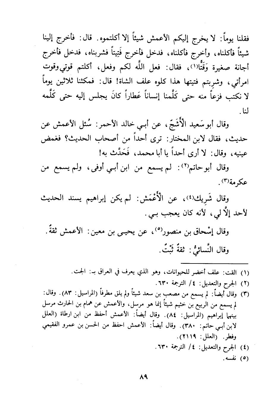 فقلنا يوما: لا يخرج إليكم الأعمش شيئا إلا أكلتموه. قال: فأخرج إلينا شيئا فأكلناه، وأخرج فأكلناه، فدخل فاخرج فتيتا فشربناه، فدخل فأخرج اجانة صغيرة وقتا (1) ، فقال: فعل اللَّه لكم وفعل، اكلتم قوتي وقوت امرأتي، وشربتم فتيتها هذا كلوه علف الشاة! قال: فمكثنا ثلاثين يوما لانكتب فزعا منه حتى كلمنا إنسانا عطارا كَانَ يجلس إليه حتى كلمه لنا.
