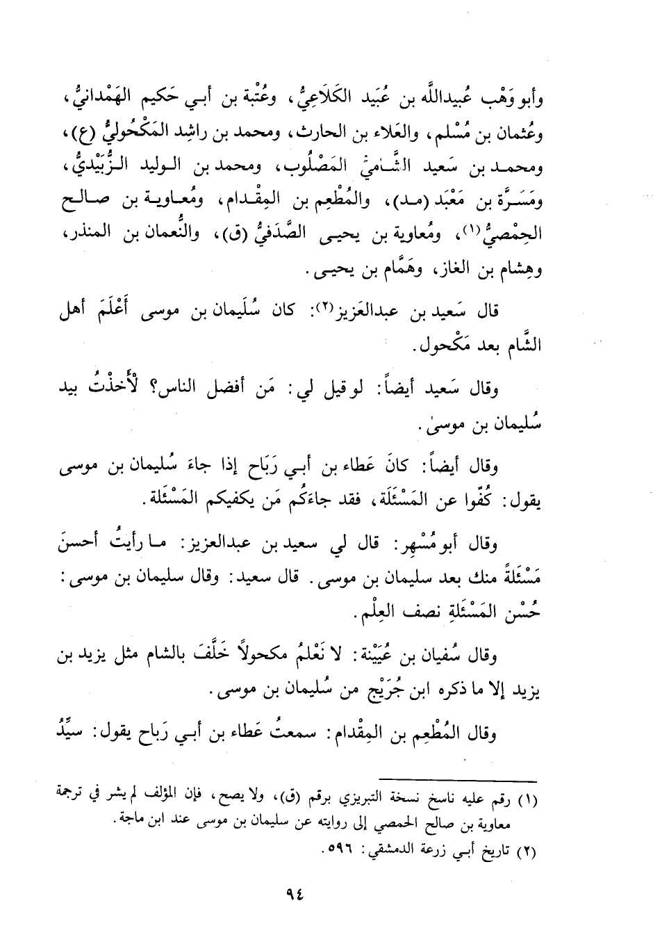 (1) رقم عليه ناسخ نسخة التبريزي برقم (ق) ، ولا يصح، فإن المؤلف لم يشر في ترجمة معاوية بن صالح الحمصي إلى روايته عن سُلَيْمان بن موسى عند ابن ماجة.