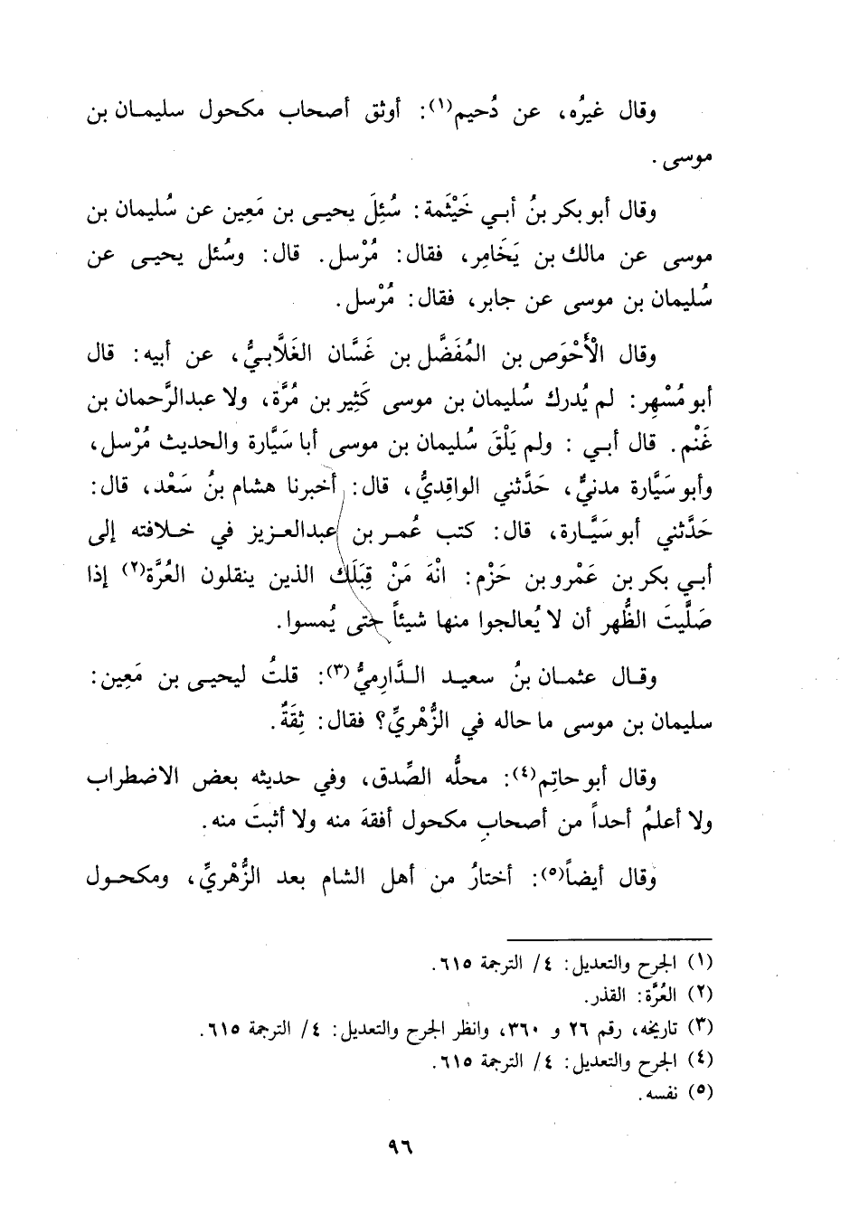 وَقَال أَبُو بَكْر بْن أَبي خيثمة: سئل يَحْيَى بْن مَعِين عَنْ سُلَيْمان بْن مُوسَى عَنْ مَالِك بْن يخامر، فقال: مرسل. قال: وسئل يحيى عَنْ سُلَيْمان بْن مُوسَى عَنْ جابر، فقال: مرسل.