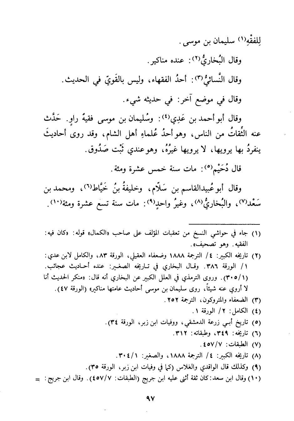 (2) تاريخه الكبير: 4 / الترجمة 1888 وضعفاء العقيلي، الورقة 83، والكامل لابن عدي: 1 / الورقة 386. وقَال البُخارِيُّ في تاريخه الصغير: عنده أحاديث عجائب. (1 / 305) . وروى التِّرْمِذِيّ في العلل الكبير عن البخاري أنه قال: منكر الحديث أنا لاأروي عنه شيئا، روى سُلَيْمان بن موسى أحاديث عامتها مناكير" (الورقة 47) .