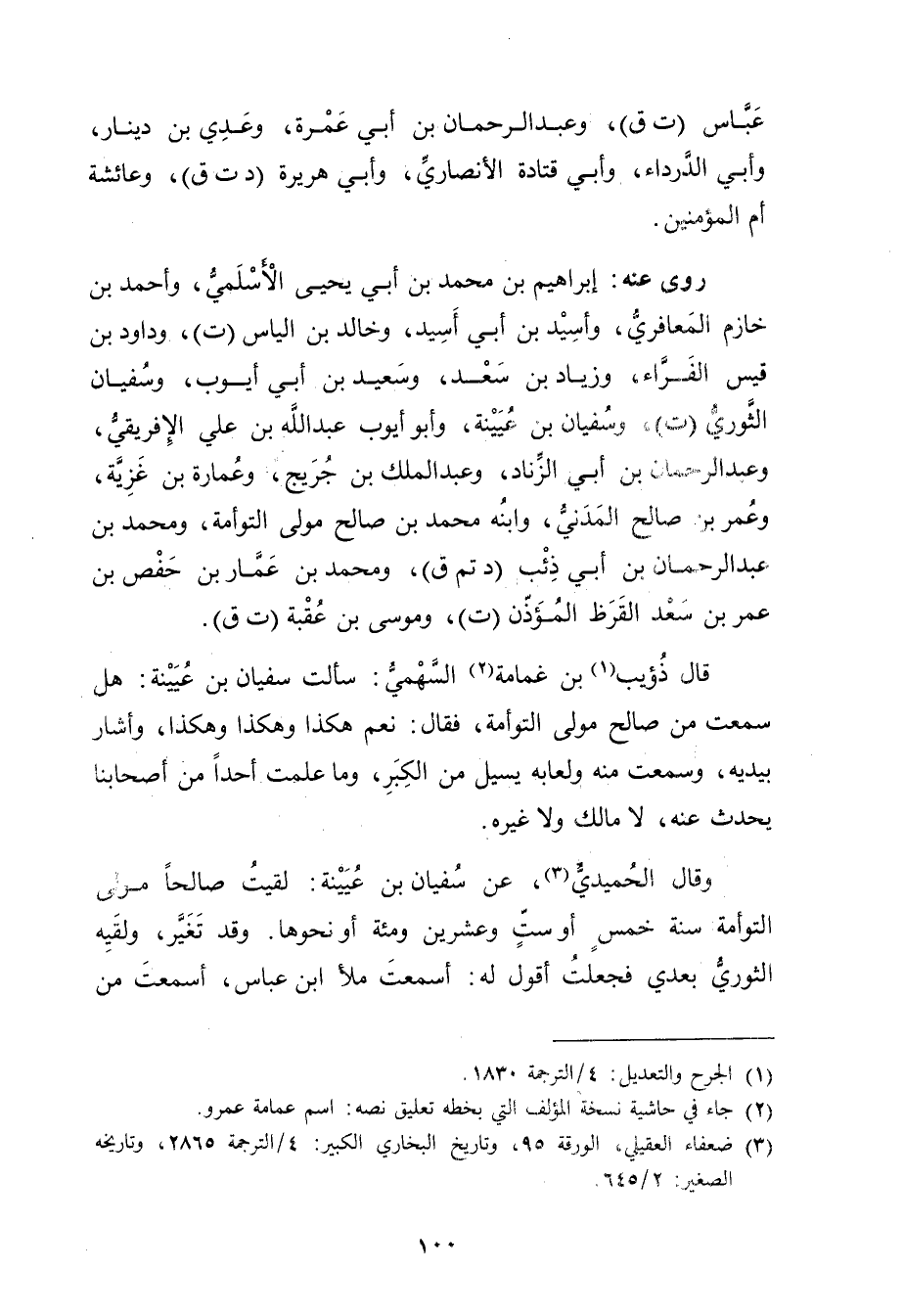 وَقَال الحميدي (3) ، عَن سفيان بْن عُيَيْنَة: لقيت صالحاً مولى التوأمة سنة خمس أو ست وعشرين ومئة أو نحوها. وقد تغير، ولقيه الثوري بعدي فجعلت أقول له: أسمعت ملا ابن عباس، أسمعت من